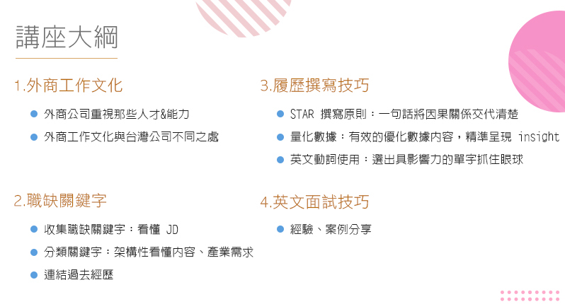 或許你是剛畢業的新鮮人,嚮往到外商公司一展長才的職場生活,或許你已經有工作經驗,想跳槽到外商公司享受完善福利領高薪,都歡迎對外商工作有興趣的你報名參加!