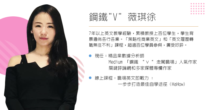 知名作家鋼鐵V在外商公司從事行銷工作多年,近年也開設商業英文、英文履歷課程。 這一次與yes123職涯學院合作的講座,將先從外商工作的文化開始,教你如何從職缺中看出公司重視的人才特質是甚麼,再告訴你應該如何撰寫英文履歷、準備面試,才能脫穎而出,前進外商工作!