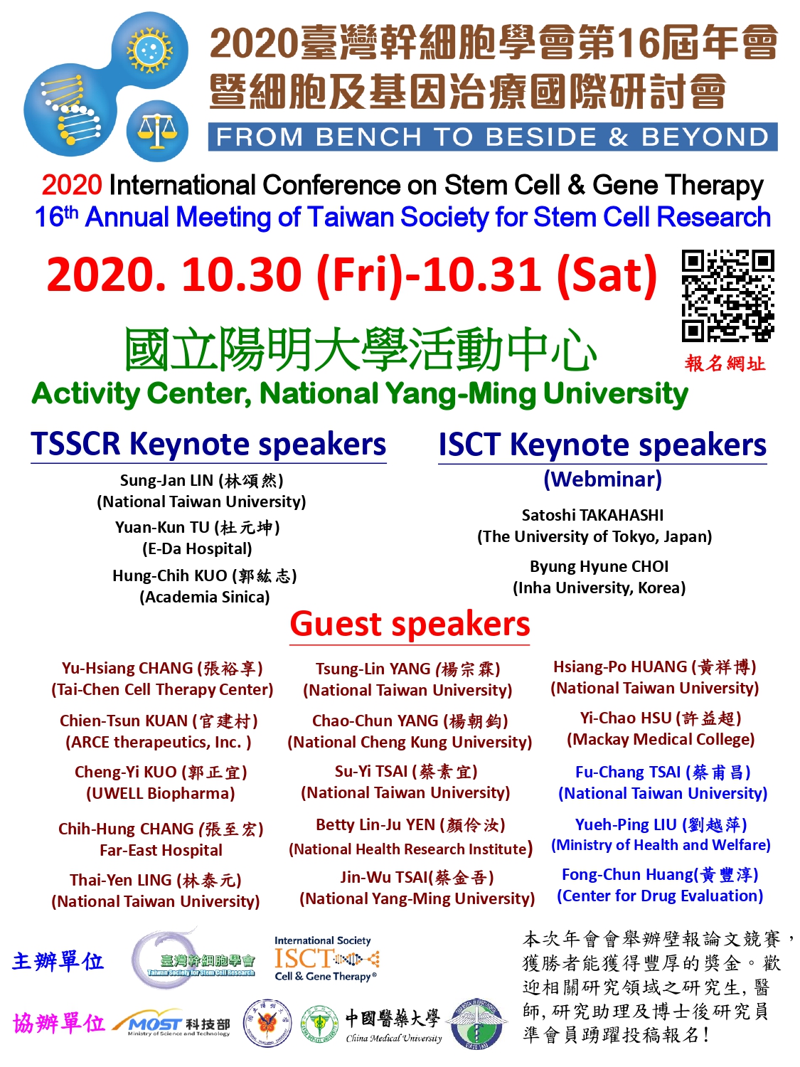 The United Nations estimates that between now and 2050, the share of the population aged 60 and older will increase in every country. Regenerative medicine research to “rejuvinate” human beings in cellular and organism basis therefore becomes an important area to investigate. Taiwan Society for Stem Cell Research (TSSCR) had organized regular international conferences aiming to bridge basic/translational research to clinic over past decades. For the first time, this year TSSCR will host the annual meeting in joint with the International Society of Cell and Gene Therapy (ISCT) – Asia region, even under this terrifying pandamic era. The conference will be held physically on-site at National Yang-Ming University at Taipei and numbers of domestic stem cell reseach experts and two slots of Webminars from ISCT sponsored speakers from Japan and Korea are invited to share their exciting Scienfic progress.