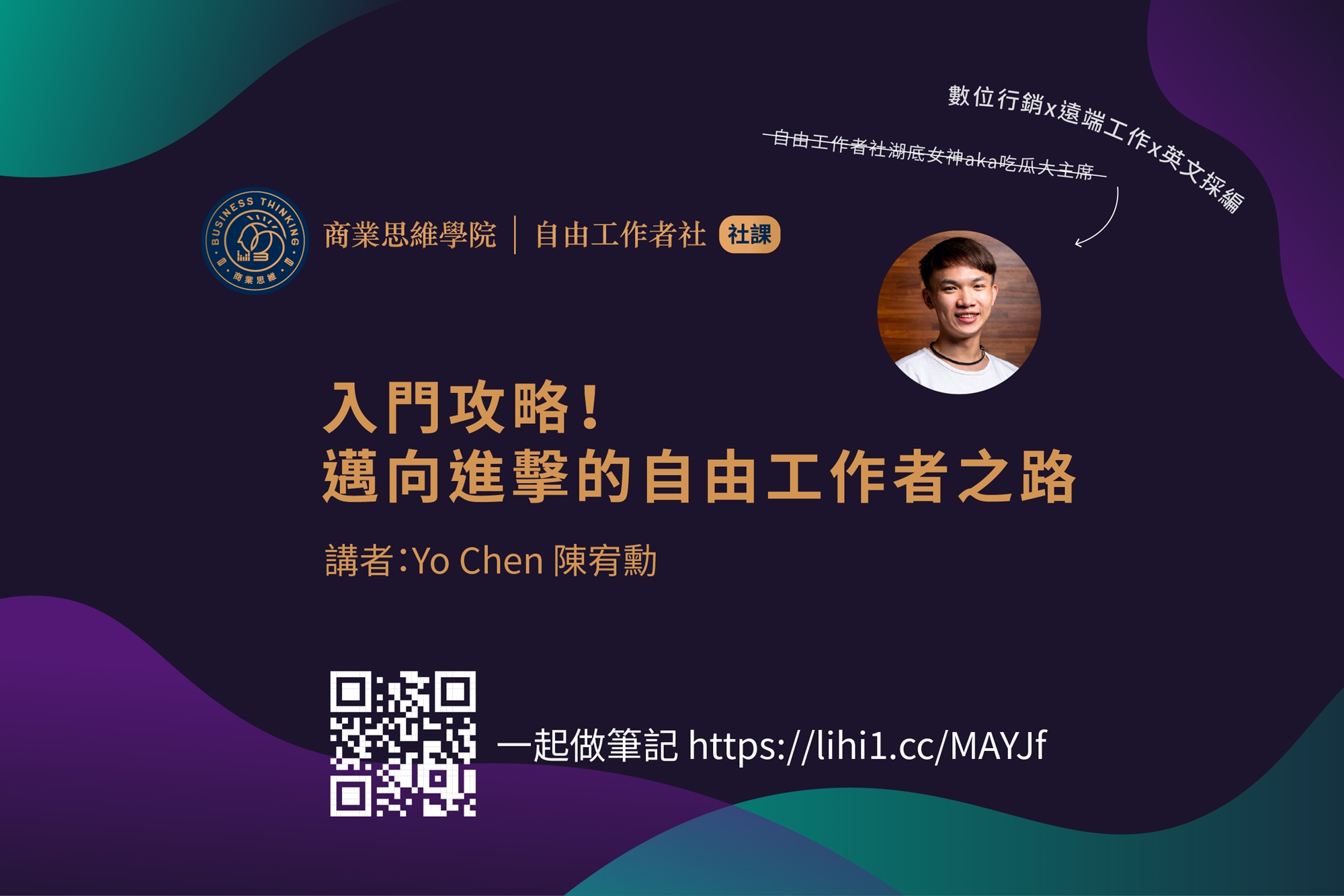 這堂課會根據講師的國內外工作的經驗、從自由接案走到創業看過的案例進行分享另外,這堂課從核心概念、應用到案例帶你完整規劃,包含整個數位環境一路帶你看到個人執行的層面,手把手搭配不同的目的找到適合你的做法。