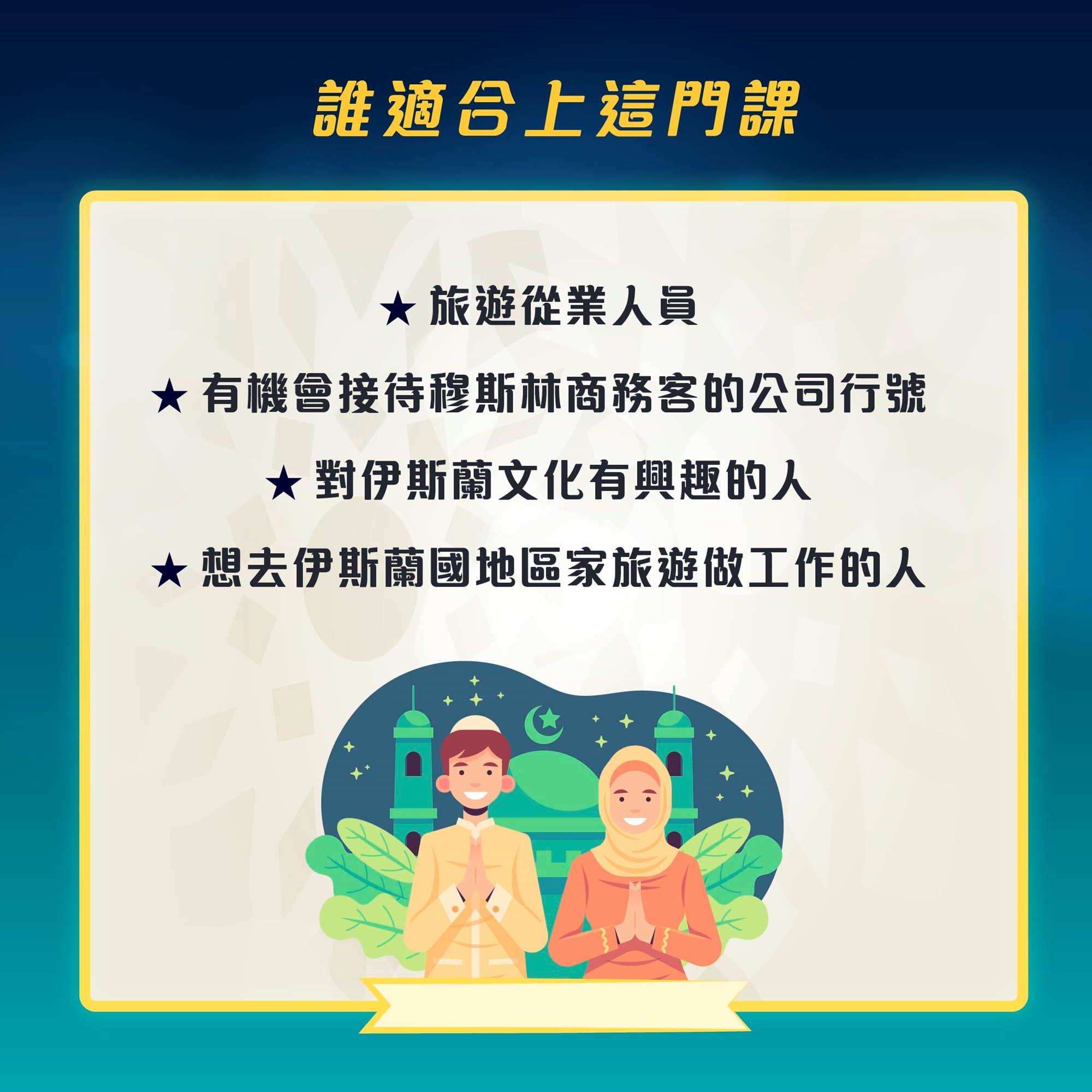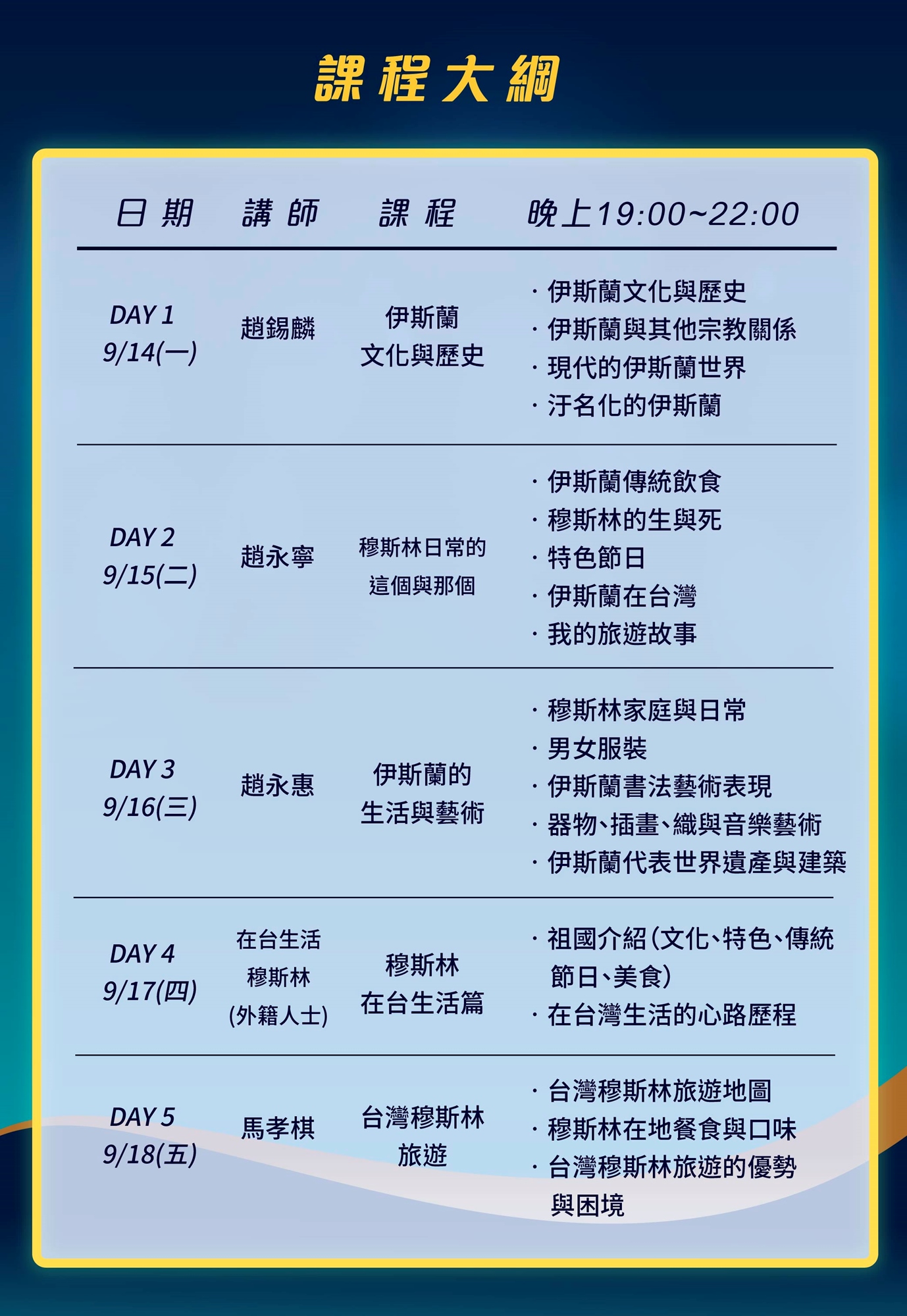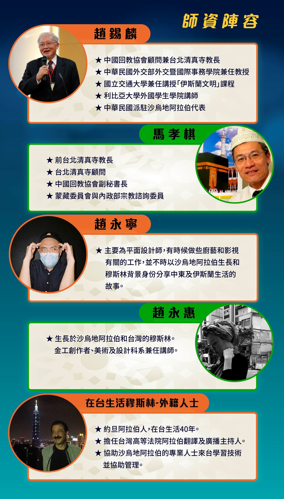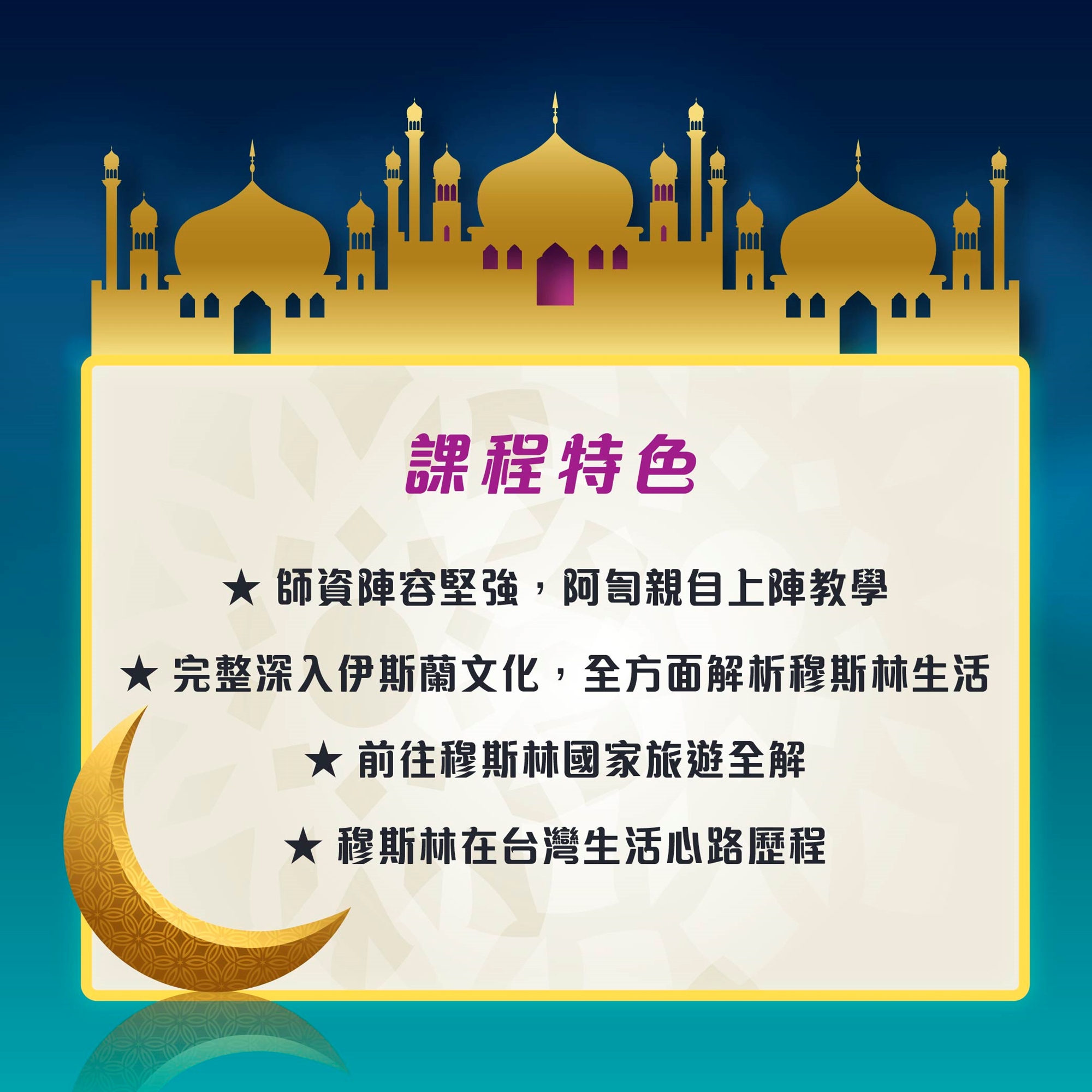 本課程帶你深入淺出伊斯蘭文化、歷史、信仰與穆斯林生活方式、藝術、音樂、建築等全方面賞析。邀請到台北清真寺教長-趙錫麟博士與馬孝棋教長;在台灣生活40年之約旦阿拉伯人-艾宏模講師;以及生長在沙烏地阿拉伯的台灣穆斯林-趙永寧、趙永惠兄妹,分享中東及伊斯蘭生活的故事、藝術文化。