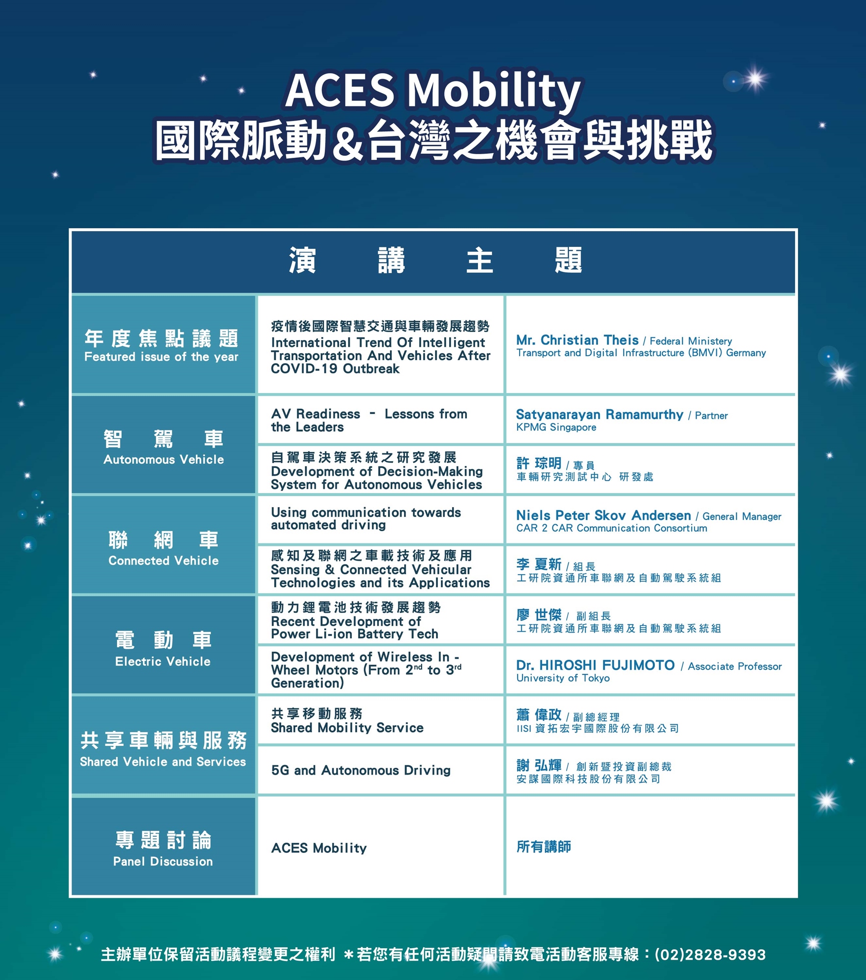 2020年台灣車輛國際論壇以「ACES Mobility國際脈動&台灣之機會與挑戰」為主題,並分成「智駕車」、「聯網車」、「電動車」、「共享車輛與服務」四大主題制作專題演講,邀請國際間重點城市智慧運輸發展之專家擔任演講講師,如德國聯邦交通部自動駕駛技術司司長Mr. Christian Theis、歐洲電信標準協會主席Niels Peter Skov Andersen、新加坡KPMG合夥人Satyanarayan Ramamurthy、東京大學副教授HIROSHI FUJIMOTO等。