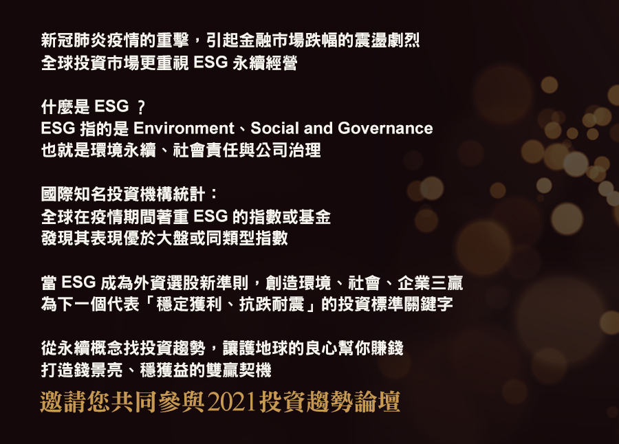 2021投資趨勢論壇 - ESG創造財富利 投資新顯學
