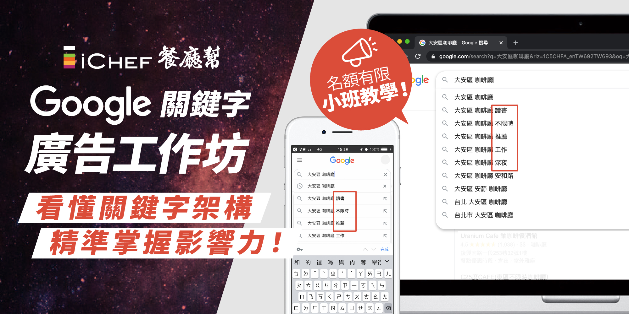 本次的工作坊將從 Google 我的商家一路講到關鍵字廣告,藉由線上的力量將消費者帶到店內用餐!