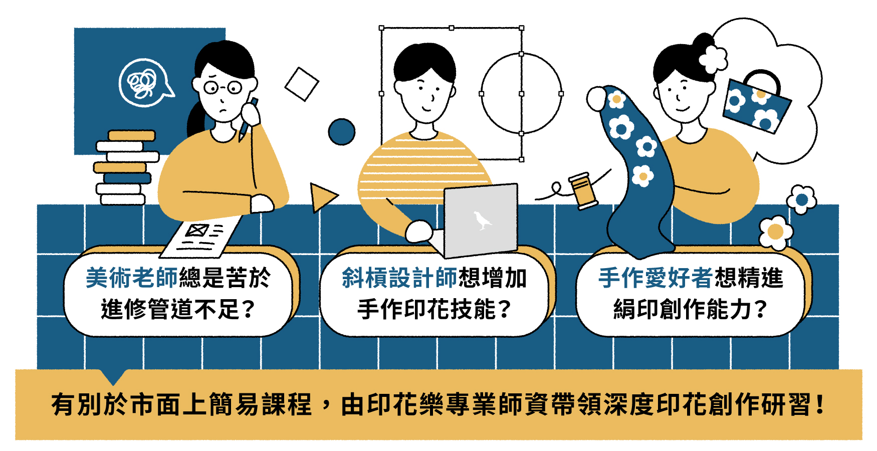 有別於市面上的簡易絹印體驗課程,由印花樂專業師資群親自帶領深度印花創作研習!