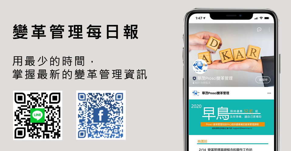 我們不定期提供線上講座 (Webinar)、研討會、Prosci 變革管理課程和免費變革管理顧問諮詢服務。若對變革管理有興趣,也歡迎多加使用我們的資源頁面 (裡面包含豐富變革管理文章、影片和下載專區)