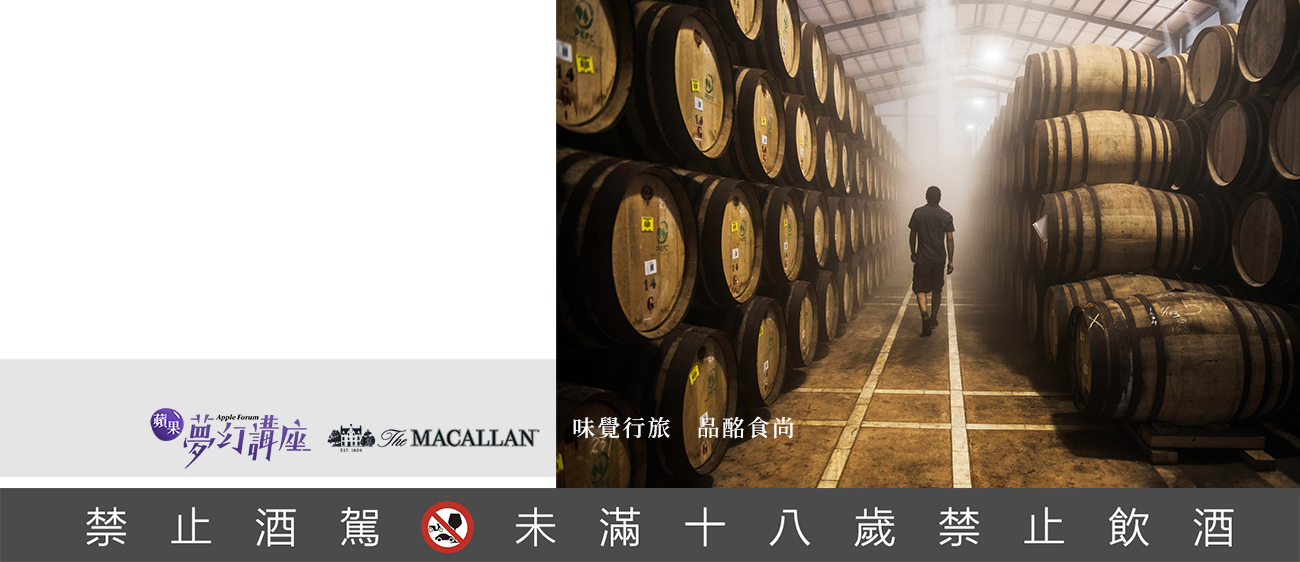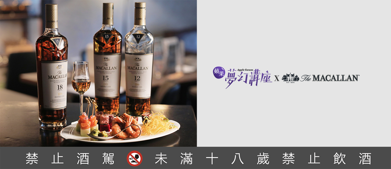 「麥卡倫雙雪莉桶系列」以歐洲紅橡木、美國白橡木兩種雪莉桶和諧勾兌,推出12年、15年與18年酒款;因應雙雪莉桶豐富酒感,《蘋果夢幻講座》邀請雙料達人攜手合作,由威士忌旅遊作家梁岱琦小姐針對酒款風味定調,進行佐餐建議,再由業界知名美食達人梁幼祥老師親自設計精緻餐點,以燻鮭魚、牛、鴨胸、水果等多元、豐富食材,襯映出雙雪莉桶的多層次風味。