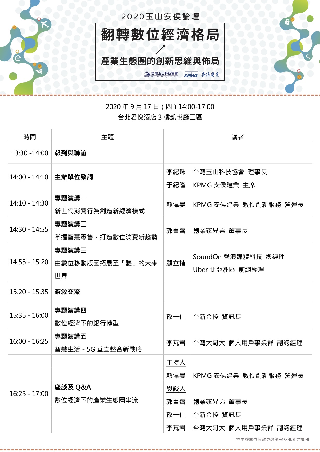 有鑑於此,KPMG安侯建業與臺灣玉山科技協會謹訂於2020年9月17日(四)舉辦2020玉山安侯論壇【翻轉數位經濟格局—產業生態圈的創新思維與佈局】,邀請業界專家們,共同針對產業生態圈等議題進行分享,並交流意見。歡迎踴躍報名參加。