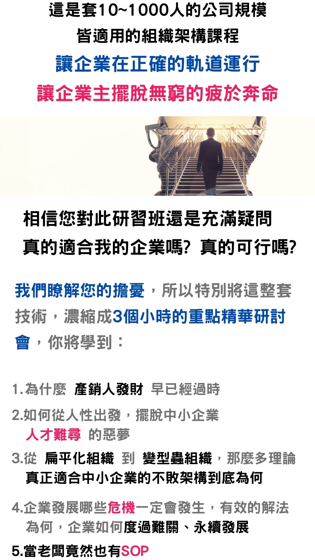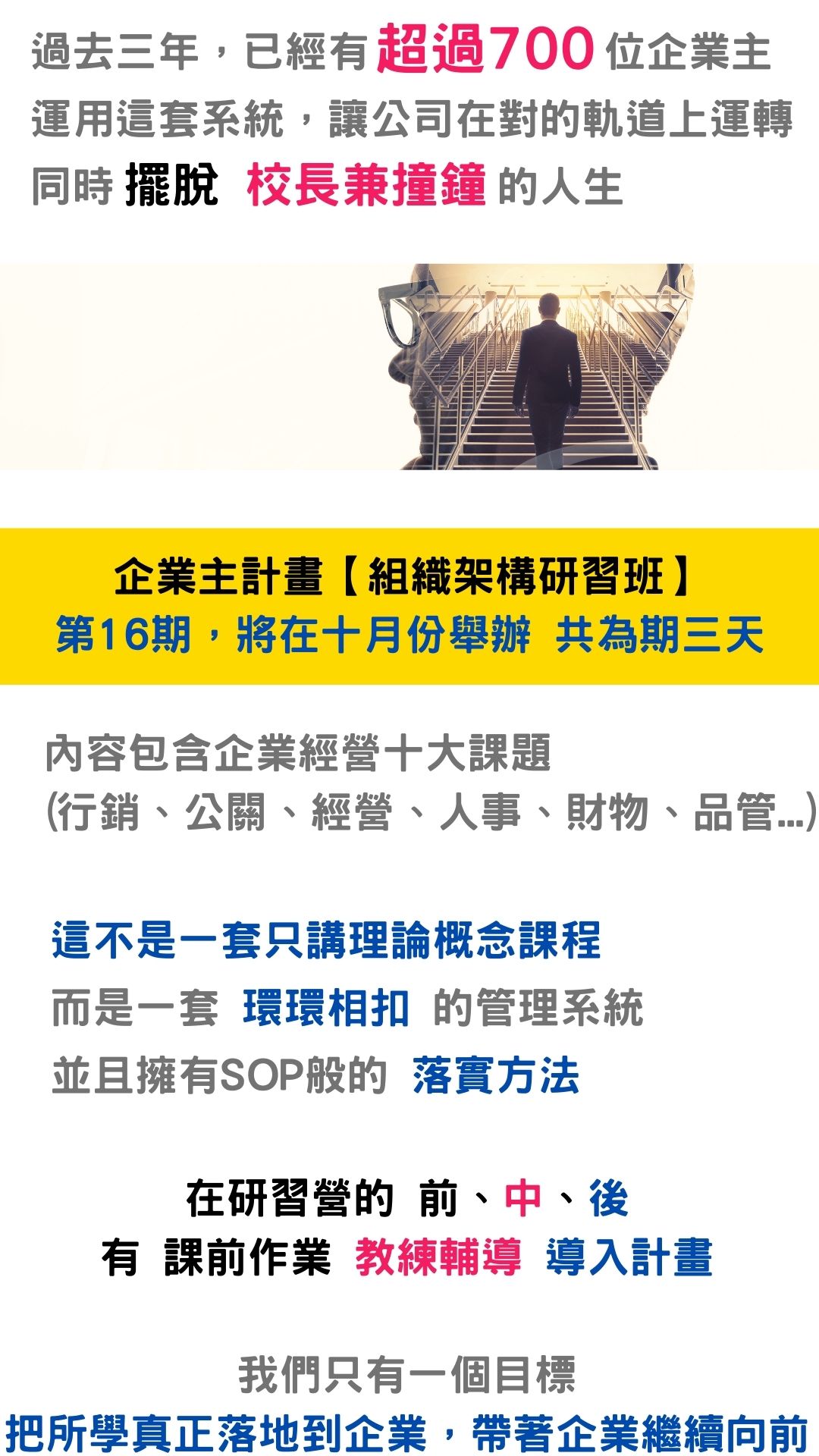 研討會將是正式課程的濃縮精華,讓您快速了解企業壯大的方向與藍圖。