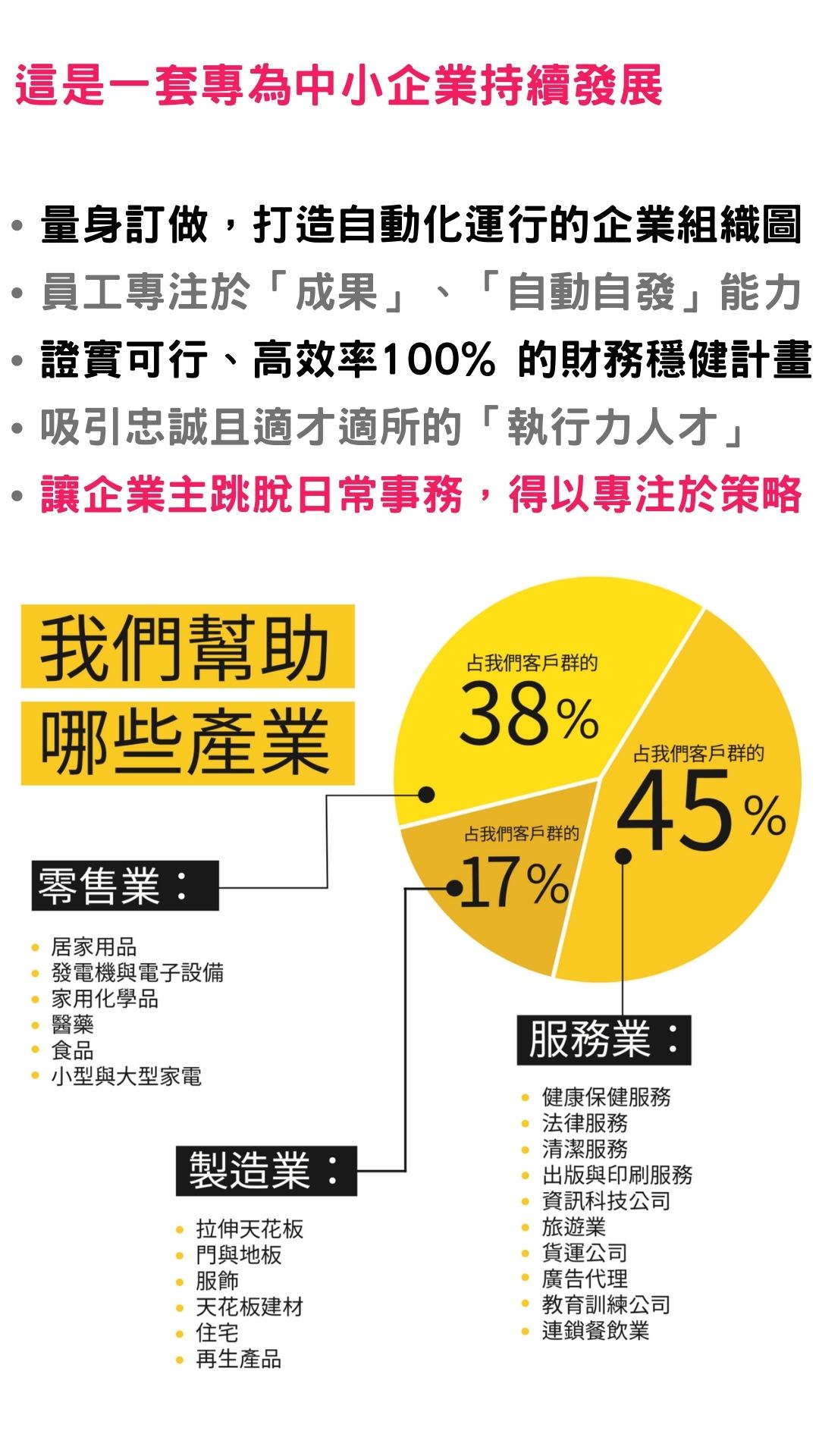 是的,這是一套10~1000人公司規模都適用的完整課程,700位以上企業主已參與課程,遍及多種產業。