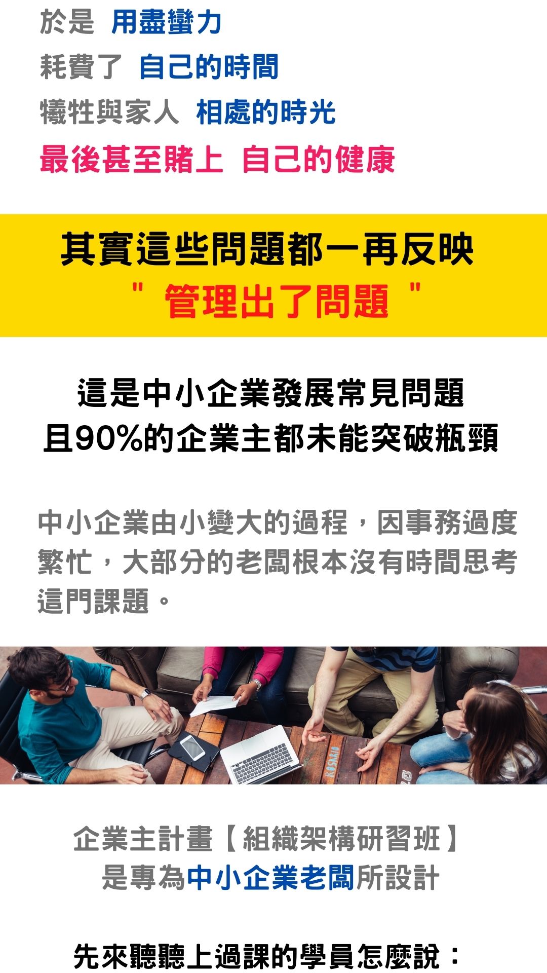10人以上公司的老闆,並且有著帶領企業繼續發展的心,歡迎參與此次試聽課程。