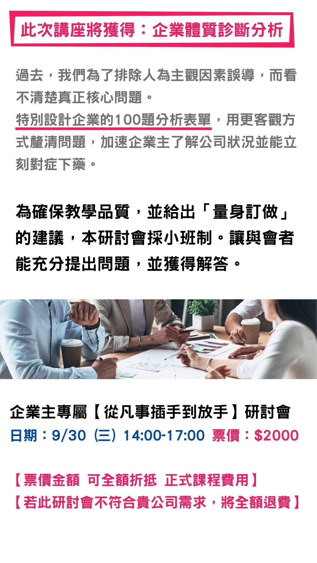 可全額折抵正式課程費用,若此研討會不符合貴公司需求,