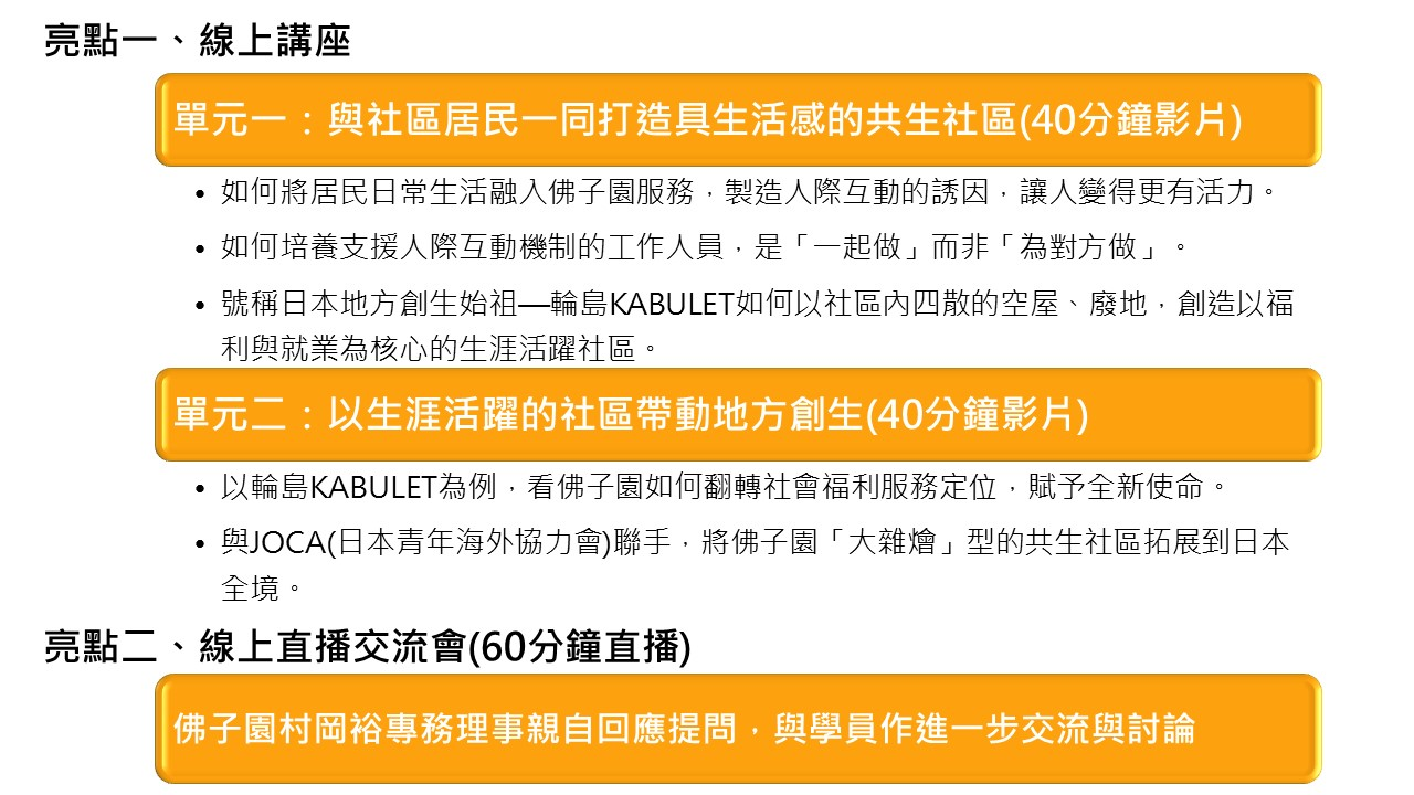 本講座系列活動包括二場單元演講(錄製影片)、一場講者線上交流討論會,由佛子園專務理事村岡裕帶領大家一步步探索如何共創不只共生,更要生涯活躍的社區。
