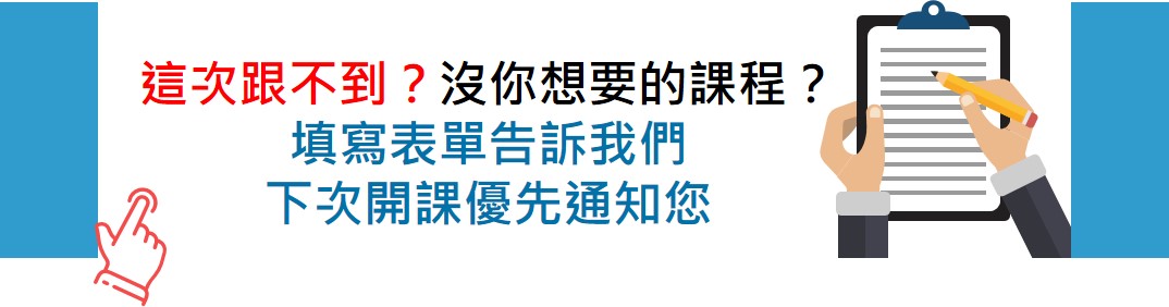 - 課程主辦單位保有修改、暫停或終止本活動之權利。如活動異動以本活動頁公告為主,如有重要異動將於活動前以簡訊/Email等方式通知報名者,請隨時注意本活動頁公告之事項與簡訊。
