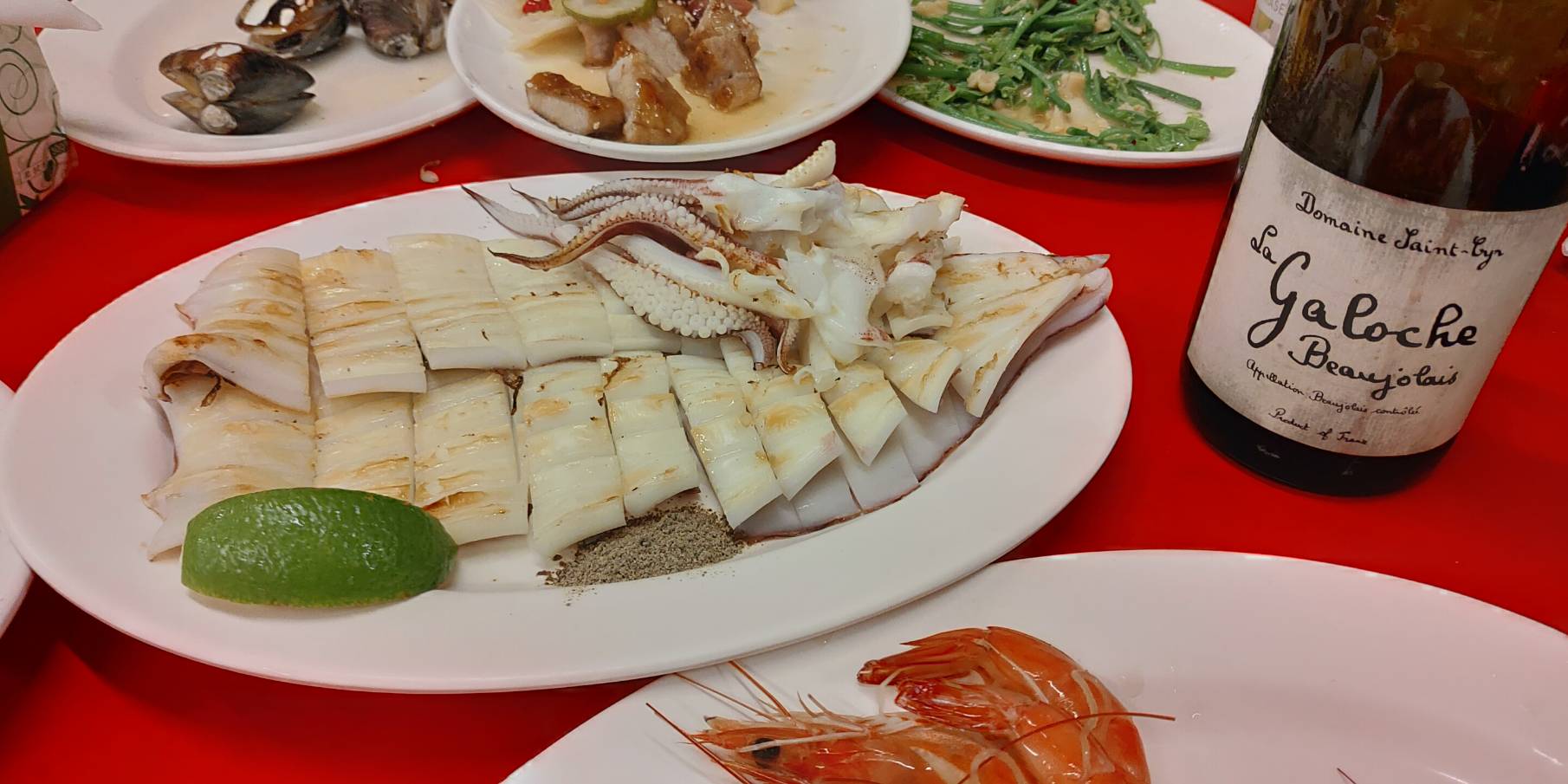 由台南在地的專業侍酒師段洋洋和兩家熱炒名店設計,佐配薄酒來的台式海味桌菜。