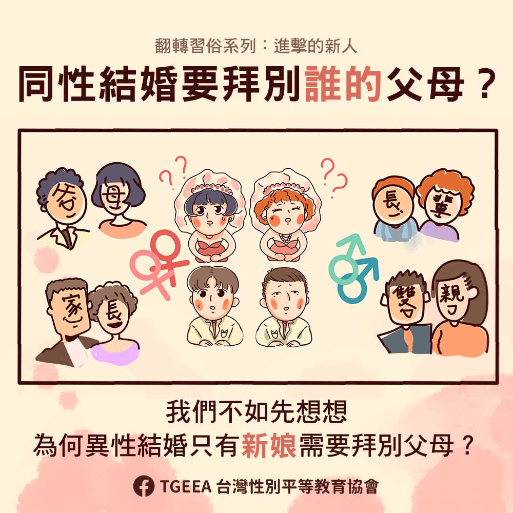 如果同性伴侶執行起來有點怪怪的,那為什麼換成男女大家就覺得不怪了呢?其實,從傳統嫁娶儀式中,我們可以反思更多隱藏的議題,10 月 20 日,聽聽 TGEEA 的賴友梅理事,與大家分享多年來她與長輩、年輕人分享婚俗議題的種種趣事,一起思索更多翻轉的可能。
