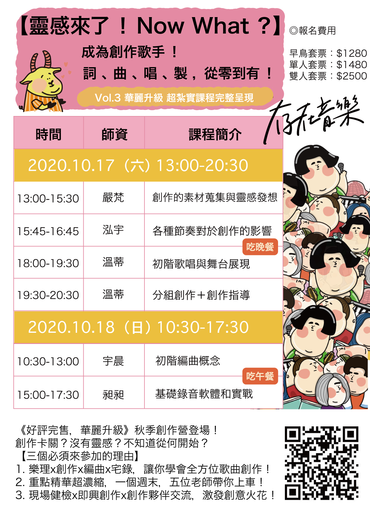 不會樂器能不能參加?可以的!藉由一個週末、兩個半天的時間,快速讓你對於創作、靈感、編曲和宅錄有從0到1的過程有概念,服下一帖創作的精華大補帖!這價錢只能說佛心做功德RRR!