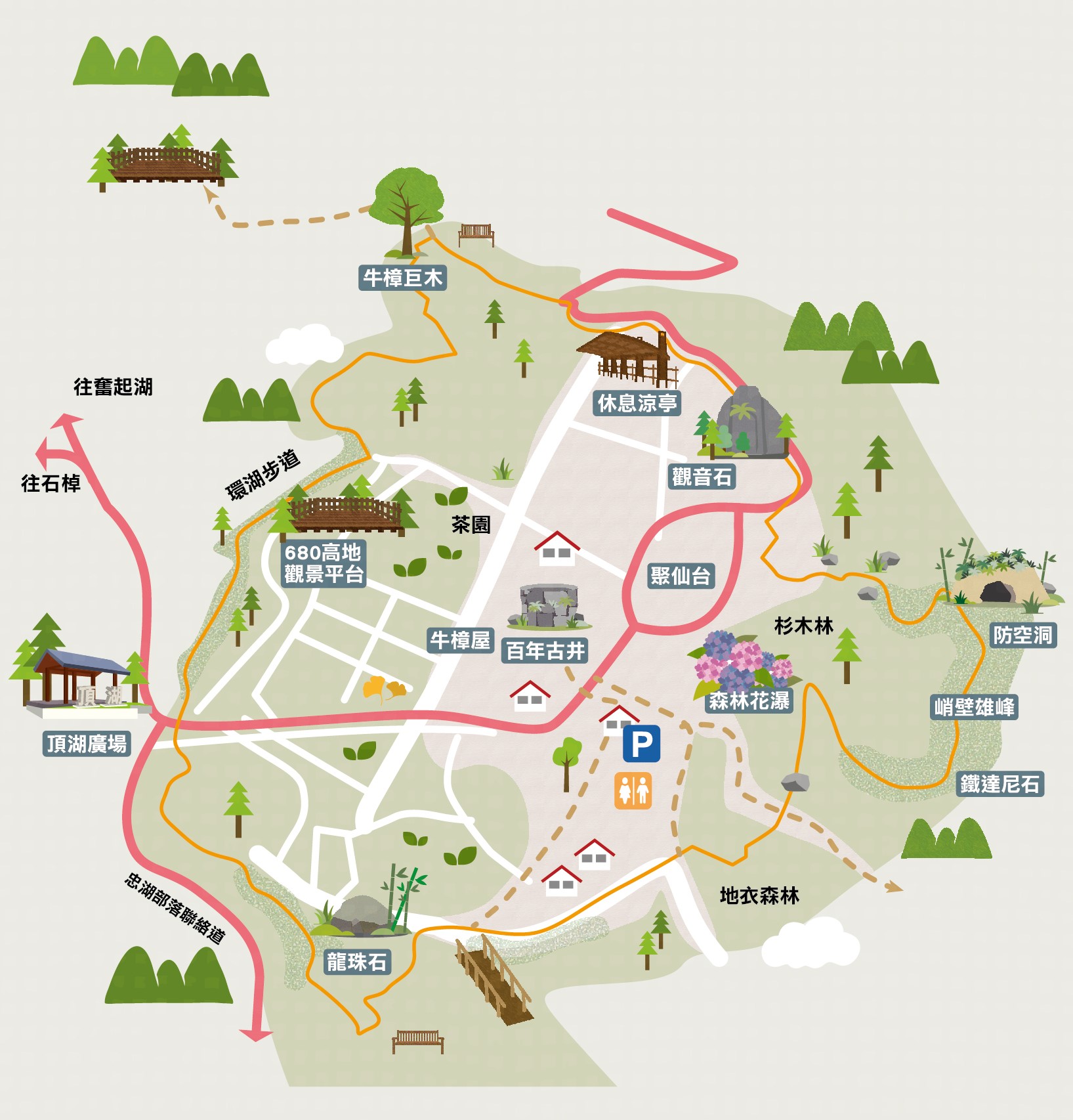 健行路線 : 觀音石登山口→(0.4K)→牛樟巨木→(0.3K)→1680高地觀景平台→(0.2K)→頂湖廣場→南段入口→(0.25K)→龍珠石(0.5K)→鐵達尼石、峭壁雄峰