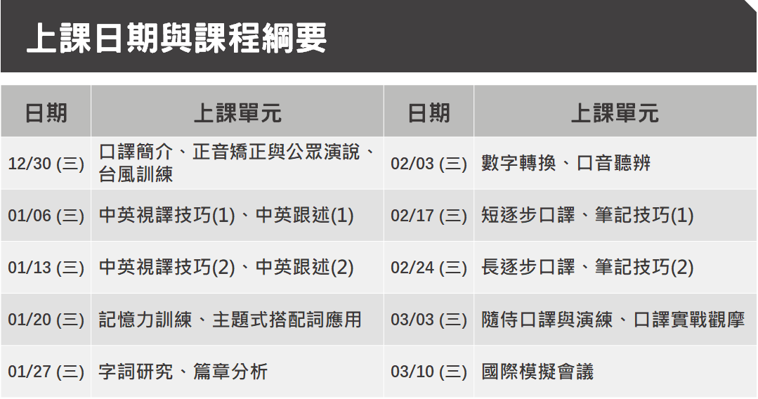 此課程為CLN「觀念英文系列」之經典課程,10 堂課,共 30 個小時的口譯技巧學習課。