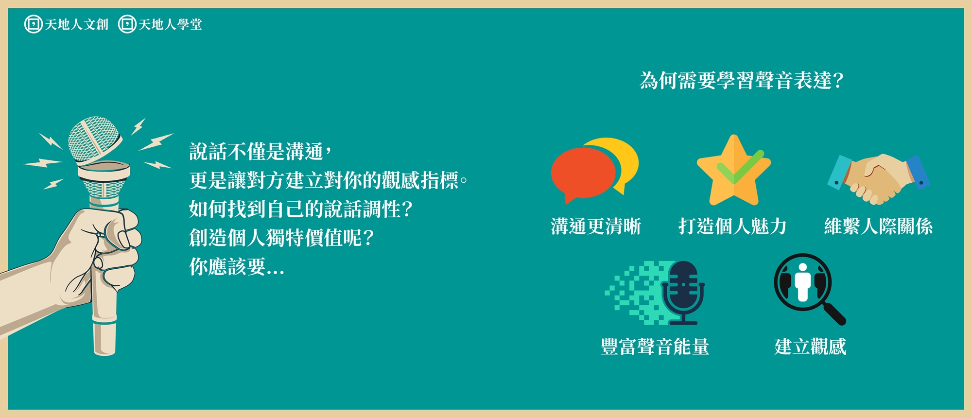 說話不只是字詞,如何透過說話聲音的情境,產生好的生動場景,才能提升聽眾的好感度。有鑑於此,天地人文創旗下天地人學堂特地規劃出「Siri 配音員教你如何正確發聲:聲音表達與情境演練培訓班」,邀請到曾任蘋果IOS系統第一代 Siri 幕後配音員以及曾任民視配音班發聲講師親臨現場,本課程將以多年業界扎實的實戰經驗由淺入深地全面解析個人聲音表達與說話情境演練等三大核心技能:(1)認識個人發聲與身體的關連;(2)把話說清楚的實務演練技巧;(3)。透過這門課程,協助新手的你瞭解室內裝潢的實戰技巧與Know-how。