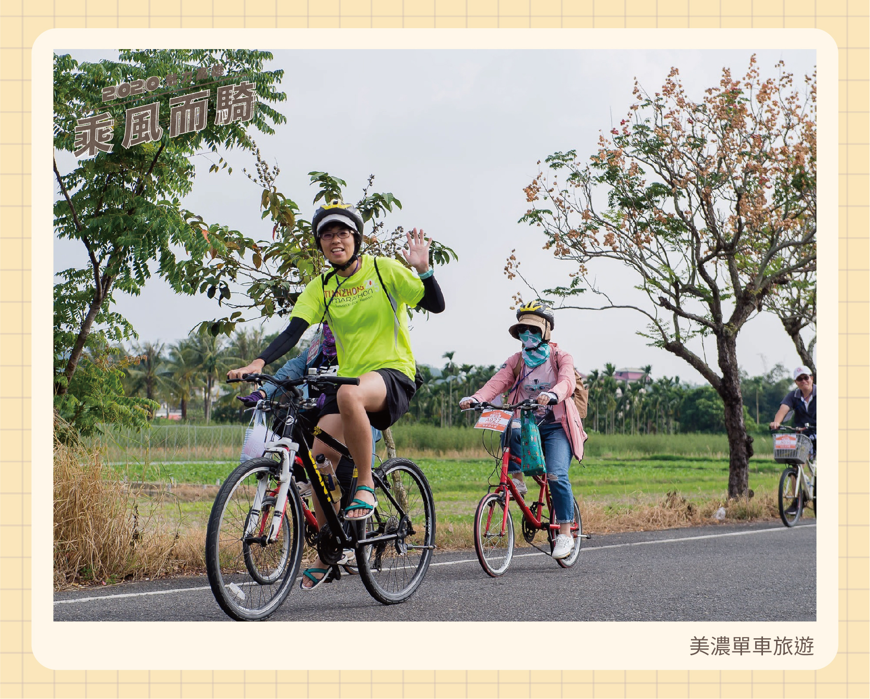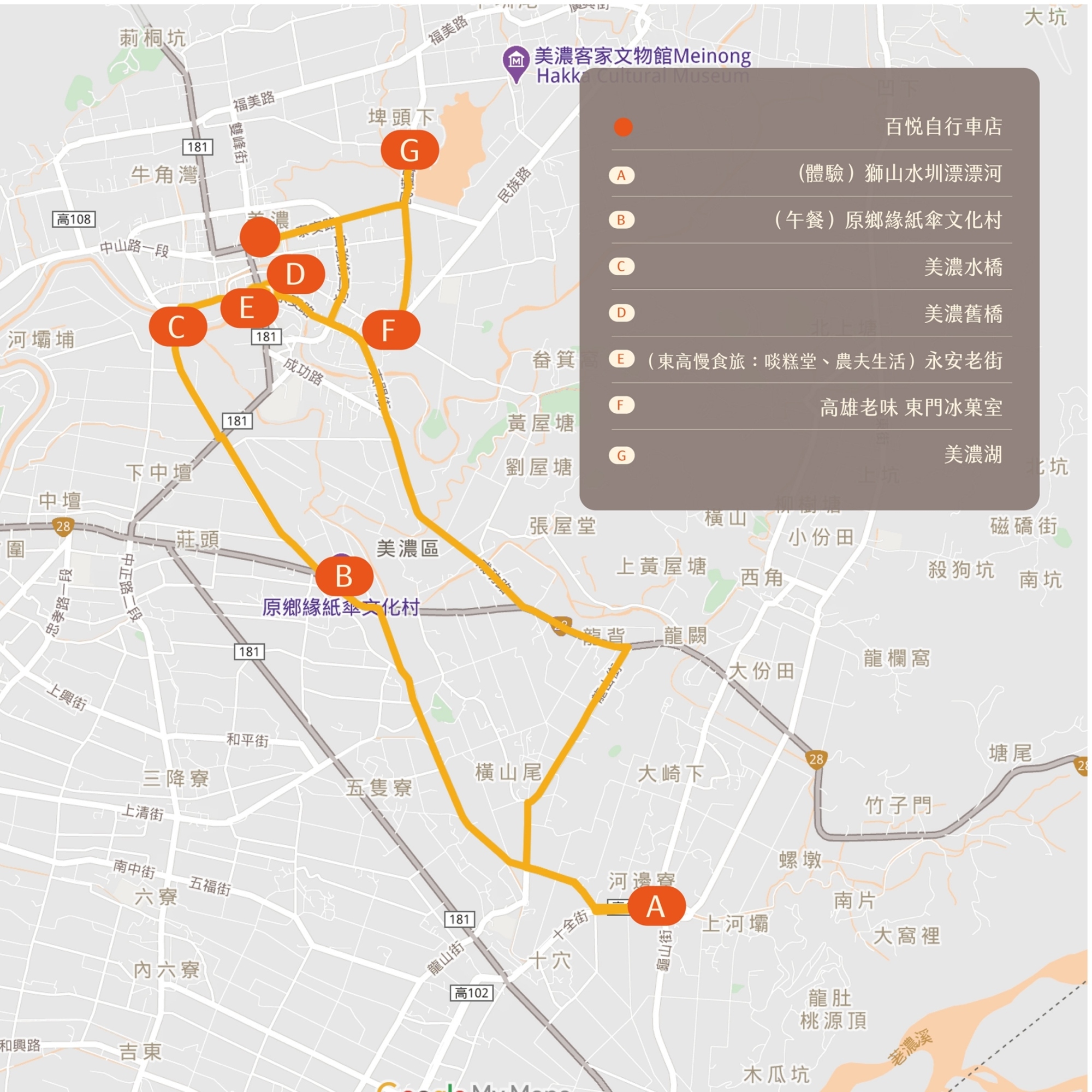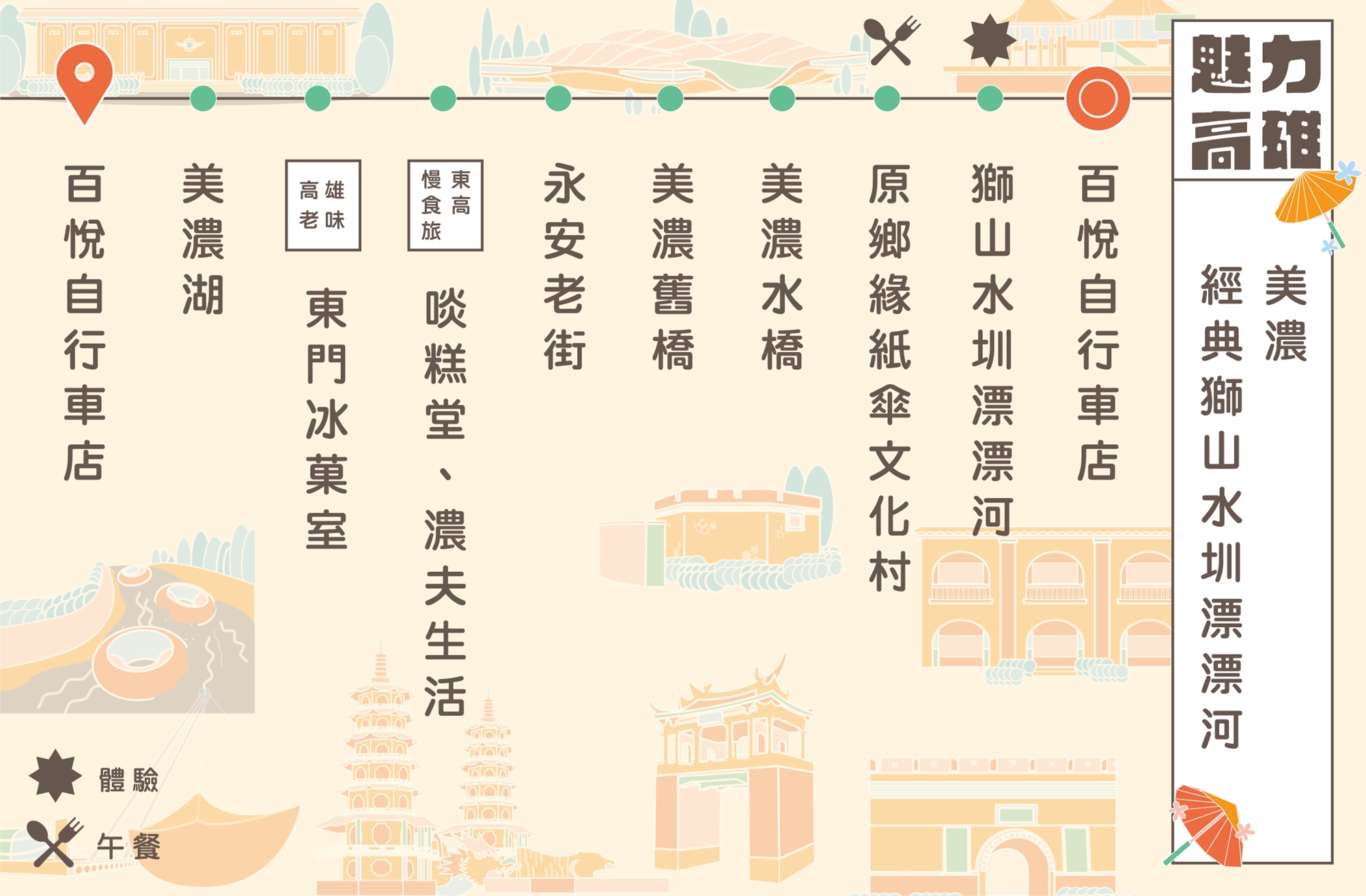 體驗獅山水圳漂漂河、午餐享用原鄉緣紙傘文化村客家風味餐 、美濃水橋、美濃舊橋、永安老街、東高慢食旅(加贈消費抵用券100元)、高雄老味:東門冰菓室、美濃湖。全程約16公里的路程,騎乘路線經美濃鄉村,充滿獨特客家風情與人文景點,喜歡單車旅遊千萬別錯過最經典的美濃單車遊程。
