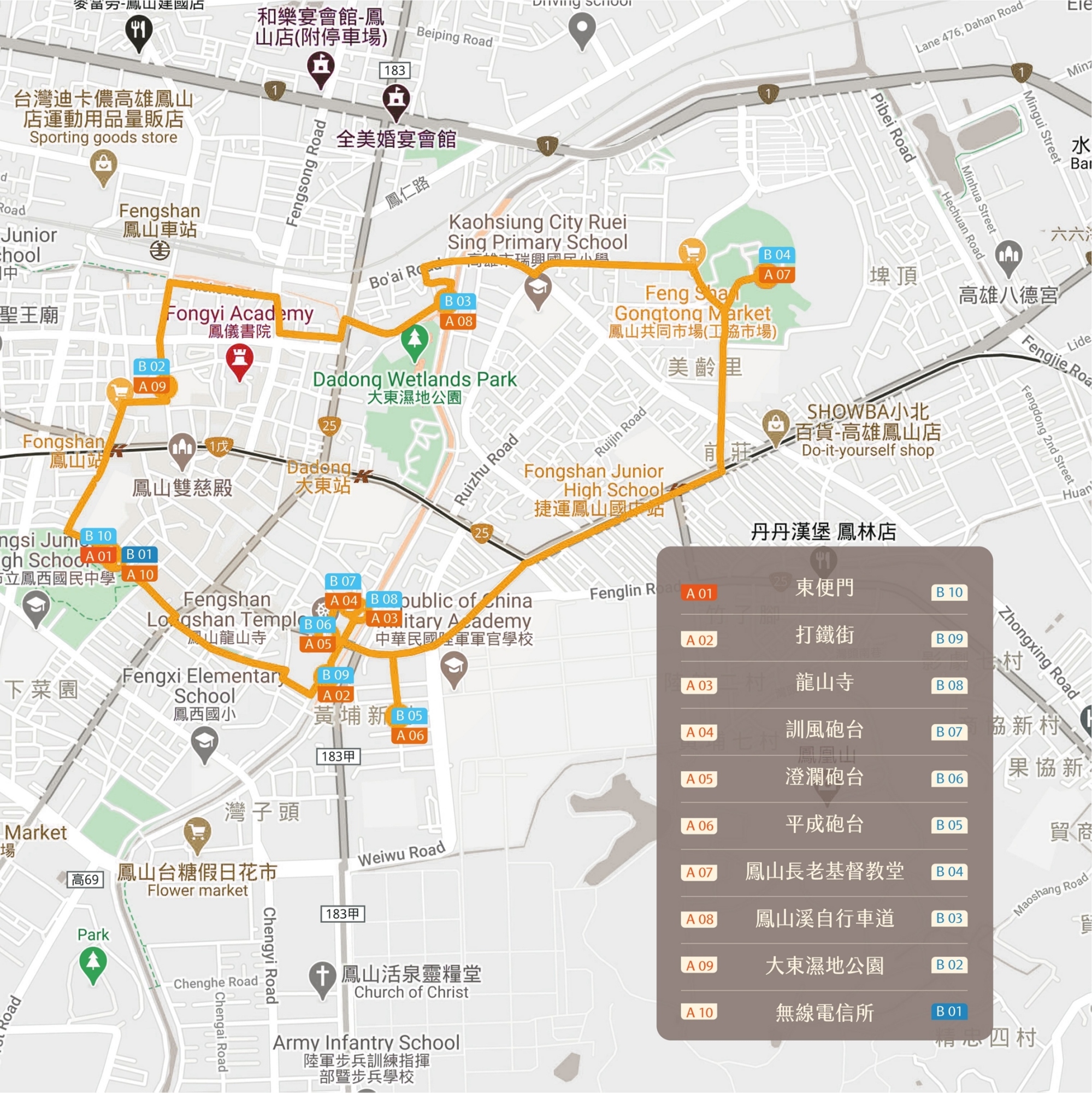 東便門(導覽)、打鐵街(體驗)、龍山寺(奉茶補水青草茶+平安糕)、訓風砲台(音樂表演)、澄瀾砲台(補給品-赤山粿、音樂表演)、平成砲台(導覽)、鳳山長老基督教堂、鳳山溪自行車道、大東濕地公園、無線電信所(補給品-大餅燒餅、導覽)