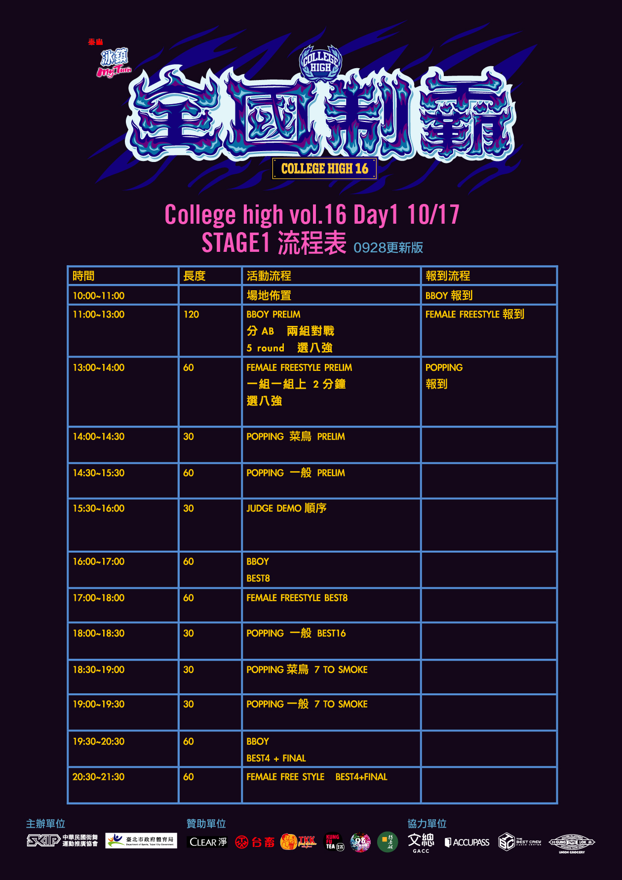 1.COLLEGE HIGH比賽對象在於所有喜愛街舞的大學生以及熱舞社團對之間的交流比賽、參賽者僅限『大專院校之在學生』夜間部、延畢生、碩博班具有學生資格者也可參加(帶職進修者則不具參賽資格),所有超過1人需要組隊的項目一律不接受跨校組隊。