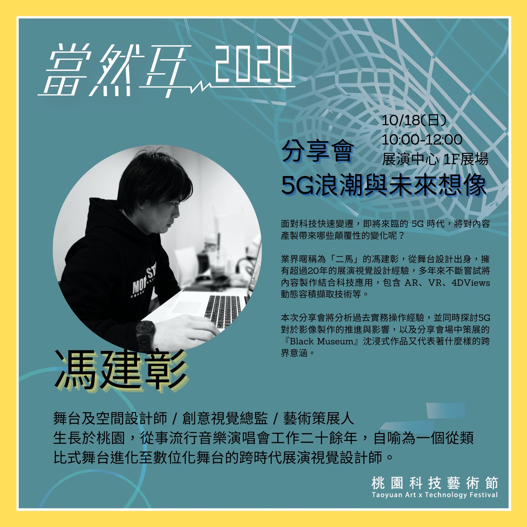 面對科技快速變遷,即將來臨的 5G 時代,將對內容產製帶來哪些顛覆性的變化呢?業界暱稱為「二馬」的馮建彰,從舞台設計出身,擁有超過20年的展演視覺設計經驗,多年來不斷嘗試將內容製作結合科技應用,包含 AR、VR、4DViews 動態容積擷取技術等。本次分享會將分析過去實務操作經驗,並同時探討5G對於影像製作的推進與影響,以及分享會場中策展的『Black Museum』沈浸式作品,又代表著什麼樣的跨界意涵。