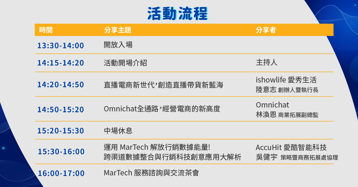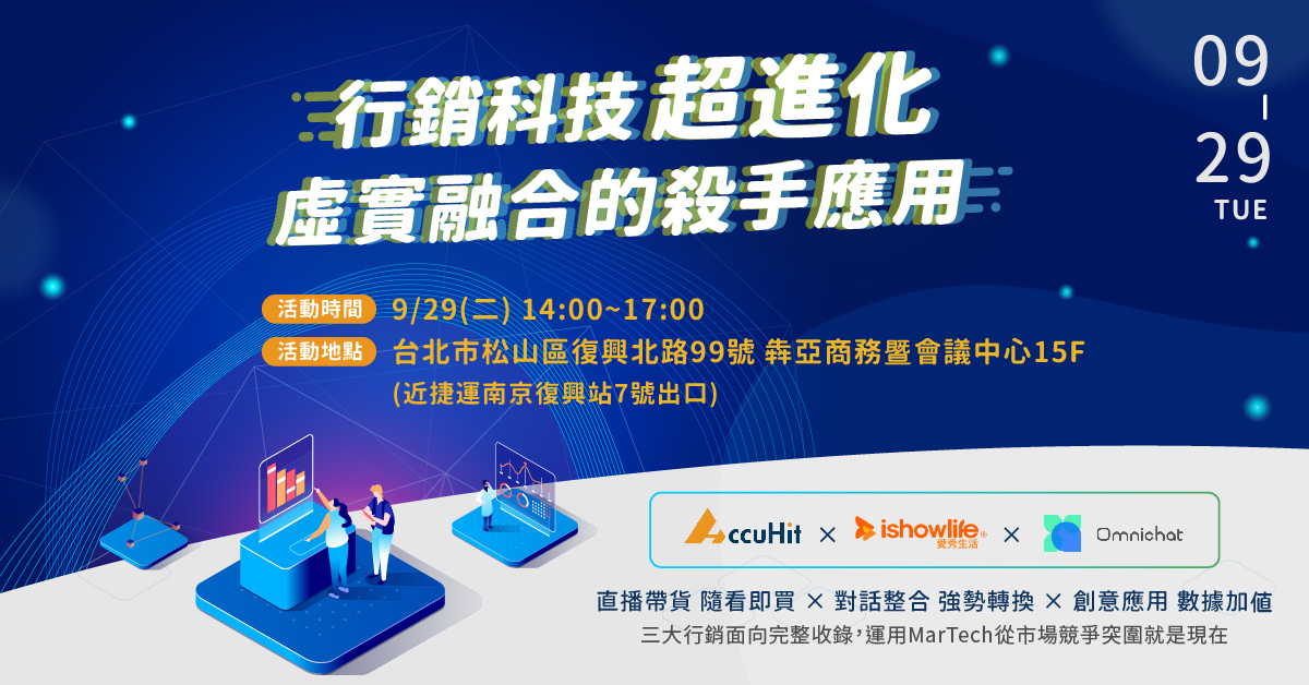 ※ 本活動採邀約制,欲參加本活動請聯繫 AccuHit 愛酷智能科技、ishowlife 愛秀生活直播電商、Omnichat 合作窗口,或填寫本表單 https://accuhit2019.typeform.com/to/hasxQ5A6