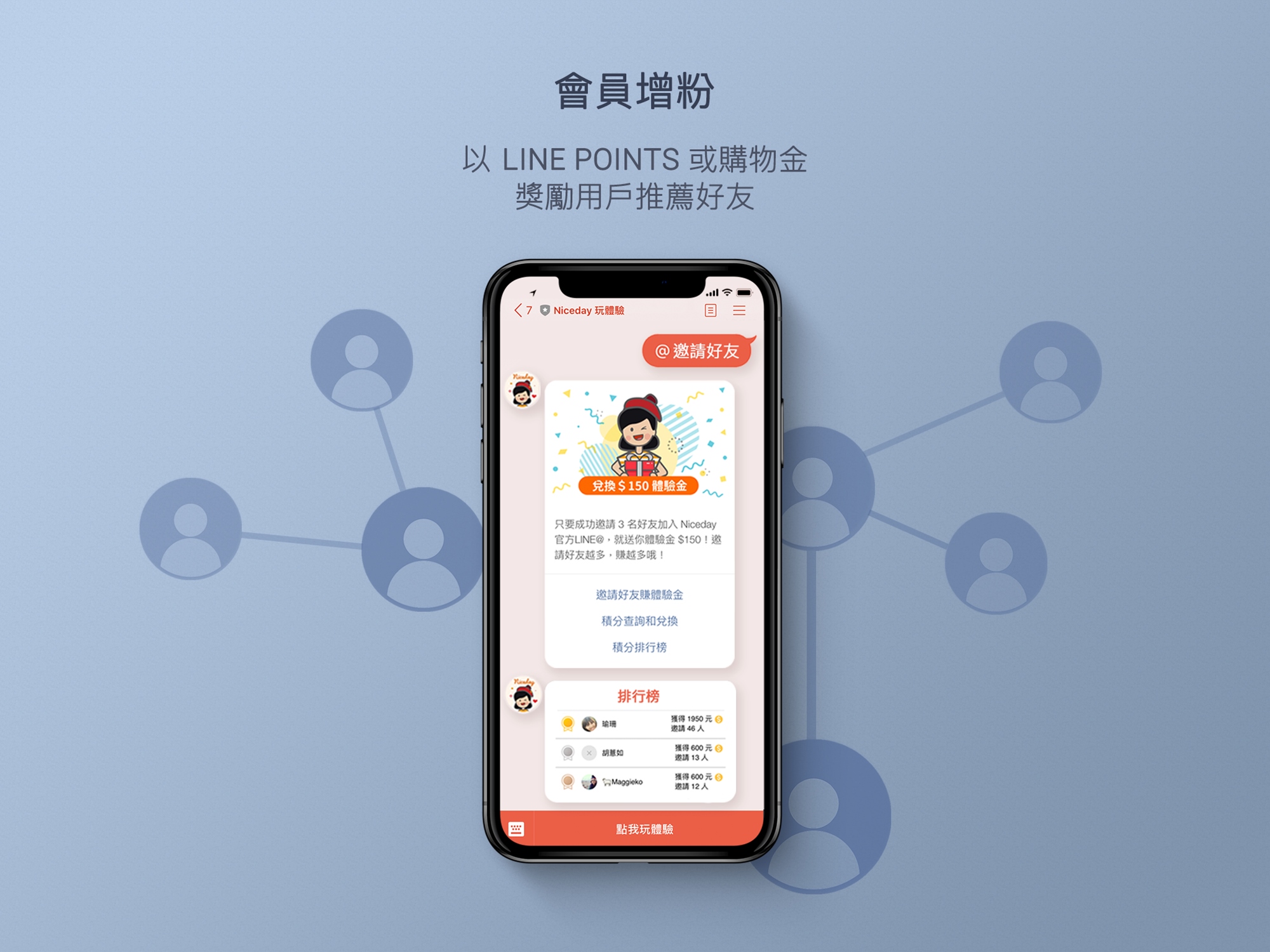 - 衝刺用戶數:以 LINE POINTS 或購物金,獎勵用戶推薦好友