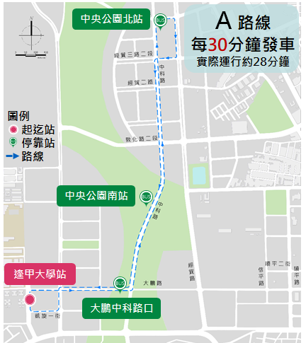 A 路線 約3.7公里,班距30分鐘,沿線依序停靠「逢甲大學站」、「大鵬中科路口」、「中央公園北站」、「中央公園南站」等4個站點;