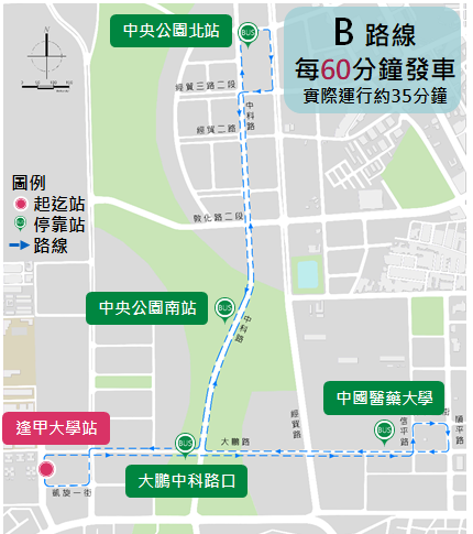 B 路線 約5.8公里,班距60分鐘,沿線依序停靠「逢甲大學站」、「大鵬中科路口」、「中國醫藥大學」、「中央公園北站」、「中央公園南站」等5個站點。