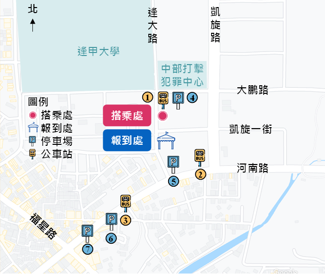 - 從台中車站搭乘32路公車,於「大鵬新城」下車,即可抵達報到處。