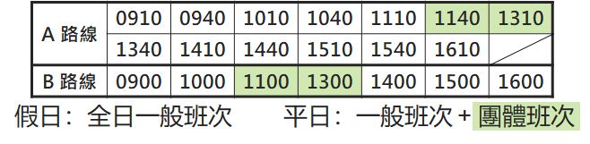 - 團體班次為 10 人(含)以上預約訂購,訂購後請主動聯絡主辦單位確定乘客資訊,主辦單位確認人數及說明規則,審酌團體情況核可票券。若團體須預約一般班次或團體人數未達 10 人,請直接重複訂購想搭乘的班次。