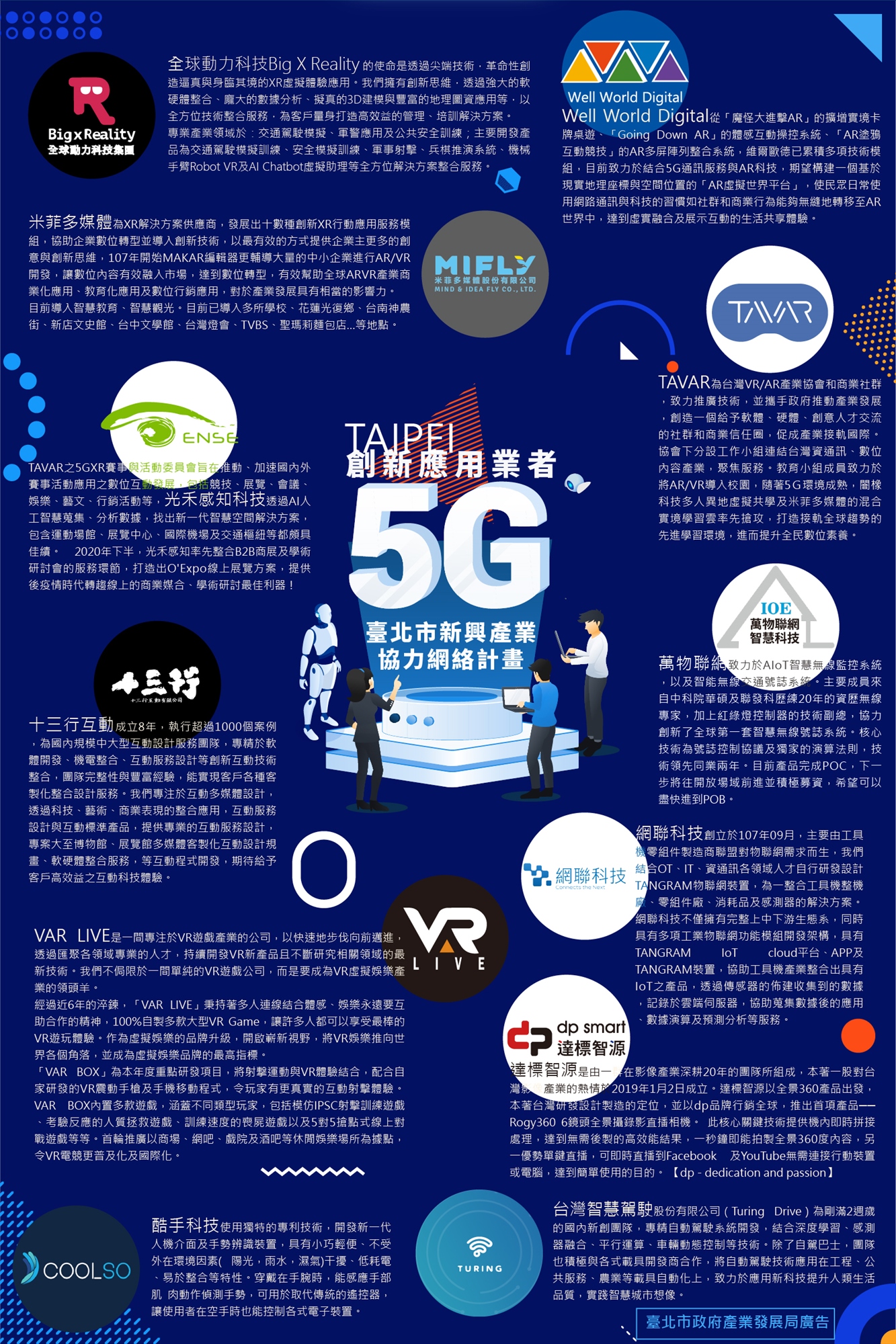 臺北市產業發展局責成工研院於10/15舉辦「5G智慧經濟創新應用論壇暨展示體驗活動」,會中將邀請DTA、IDC、APPWorks及5G體感互動、智慧展覽、VR/AR/MR/XR、國防安全、智慧交通、智慧教育、智慧機械及自動駕駛等共計10家業者及學研單位代表共襄盛舉,期透過論壇及體驗交流活動加速臺北市資通訊業者強化創新及實踐能力並注入成長動能,藉此建立正確的服務情境、產品定位及推動策略,發展可商轉且更具市場效益之實證案例。