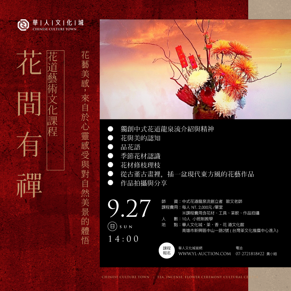 - 上課地點:高雄市新興區中山一路2號 華人文化城 (由玉竹三街台灣茶推廣中心進入)