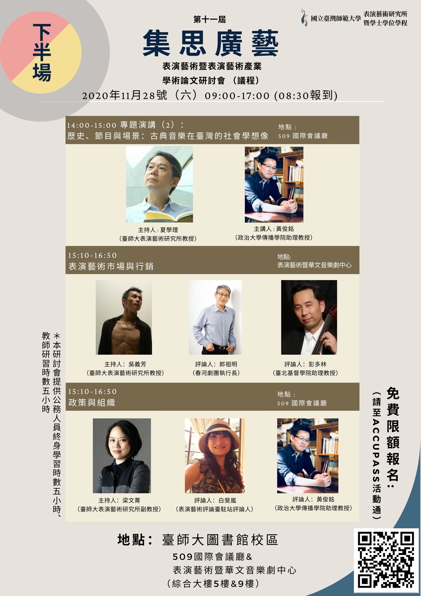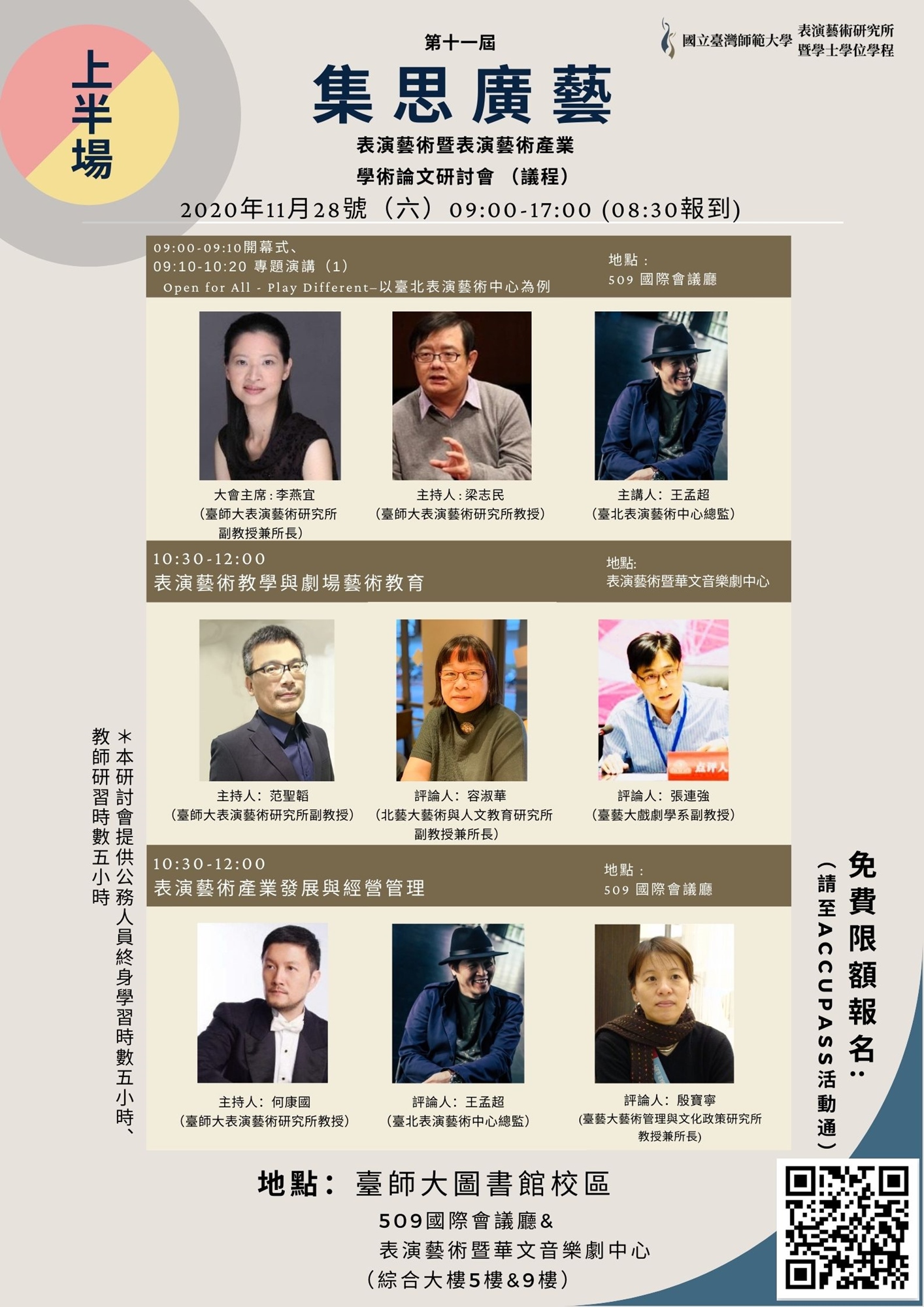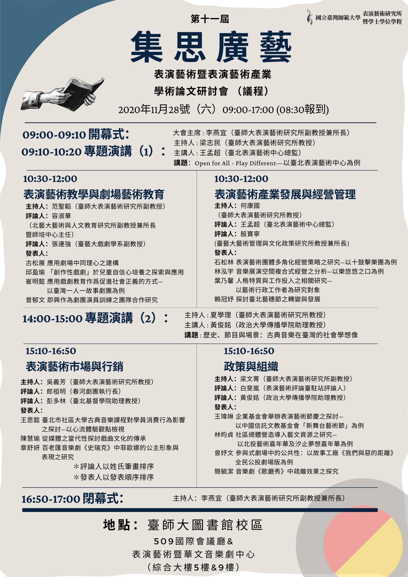 由國立臺灣師範大學表演藝術研究所主辦之第十一屆「集思廣藝表演藝術暨表演藝術產業」學術論文研討會,將於 2020 年 11 月 28 日週六,假國立臺灣師範大學圖書館校區綜合大樓5樓509國際會議廳、9樓表演藝術暨華文音樂劇中心舉行,為研究生暨各界學者專家提供論文發表和交流的機會。