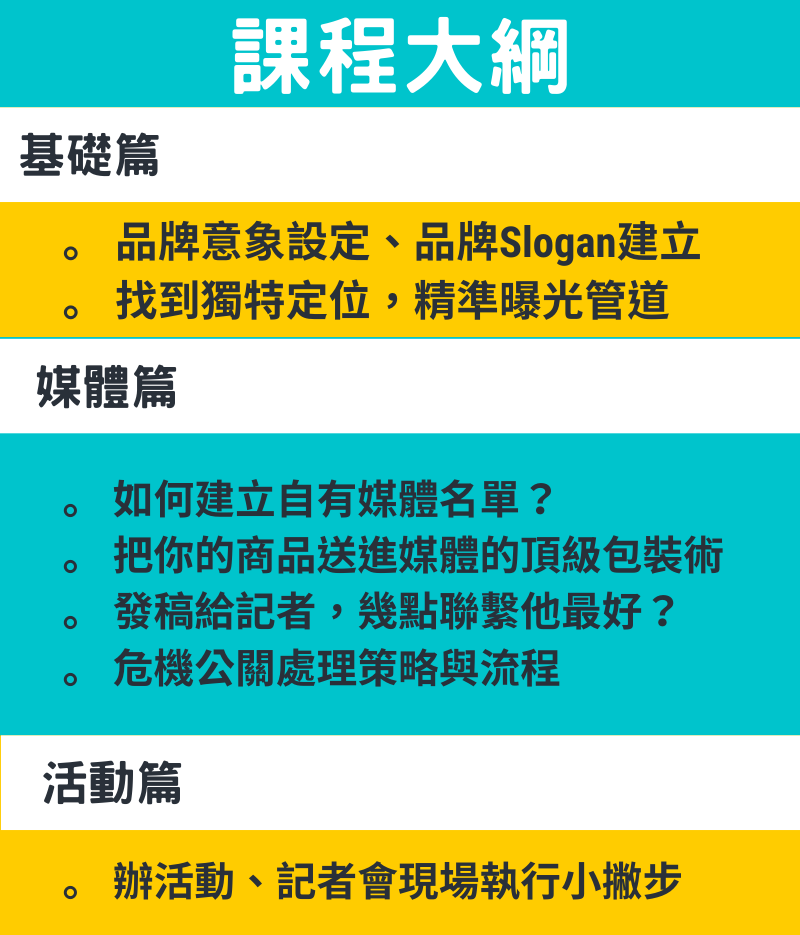 本次課程,邀請到從事企業公關工作長達15年,人稱「公關溫拿」的王蜜穜老師,指導大家如何認識記者建立媒體人脈,讓新聞稿順利被採納,以及快速應對品牌公關危機,另外若想自辦活動/記者會衝刺媒體聲量,王老師也將教你如何做出最高曝光。