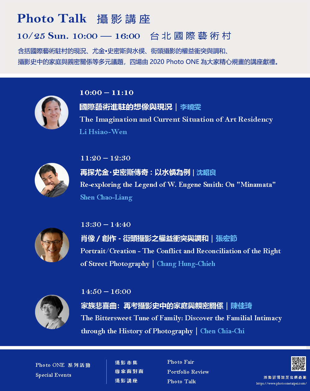 「攝影講座(Photo Talk)」於 10/25(日)邀請國內四位專家李曉雯、沈昭良、張宏節、陳佳琦,針對國際當代攝影及藝術主題提供其見解與更深入的探討。