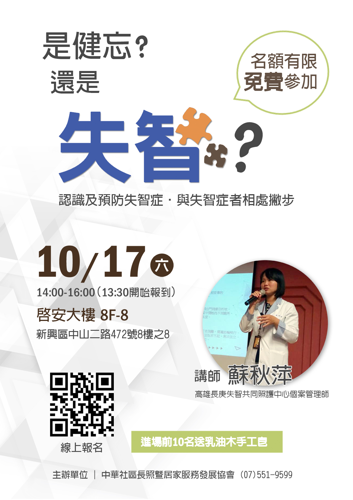 在10/17所舉辦[失智症講座],將帶您《認識失智症及了解如何預防》
