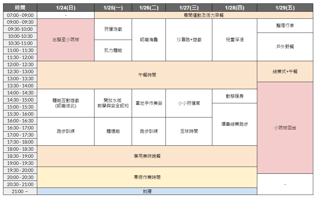 來到小琉球我們不只水上活動,更要以五感認識這些美好的生物,學習用正確的方式與大自然共處,絕對是畢生最印象深刻的體驗之一!除了奇形怪狀的礁岩、退潮時的綠藻群礁、生態豐富的潮間帶⋯等等,自然美景在這塊小小的島嶼上似乎特別容易獲得,從朝日到落日,從海平面到森林,讓我們以新的跑步模式,就是運用在西方萬聖節裡玩的撒麵粉抓鬼,有別於以往的平路衝刺,教練們事先規劃好安全路線,照著地上麵粉指示抓鬼,沿途山水環繞在邊享受島嶼的瑰麗之美時,激發觀察能力跟團隊合作能力。環保手做體驗發揮創意手腦並用,透過活動增加環保知識及DIY的樂趣。在豐富的人文環境下我們透過運動的方式,讓孩子們充分達到運動量及與同伴玩樂的趣味。讓大自然當我們的老師帶領大家來一場寒假身心成長之旅。