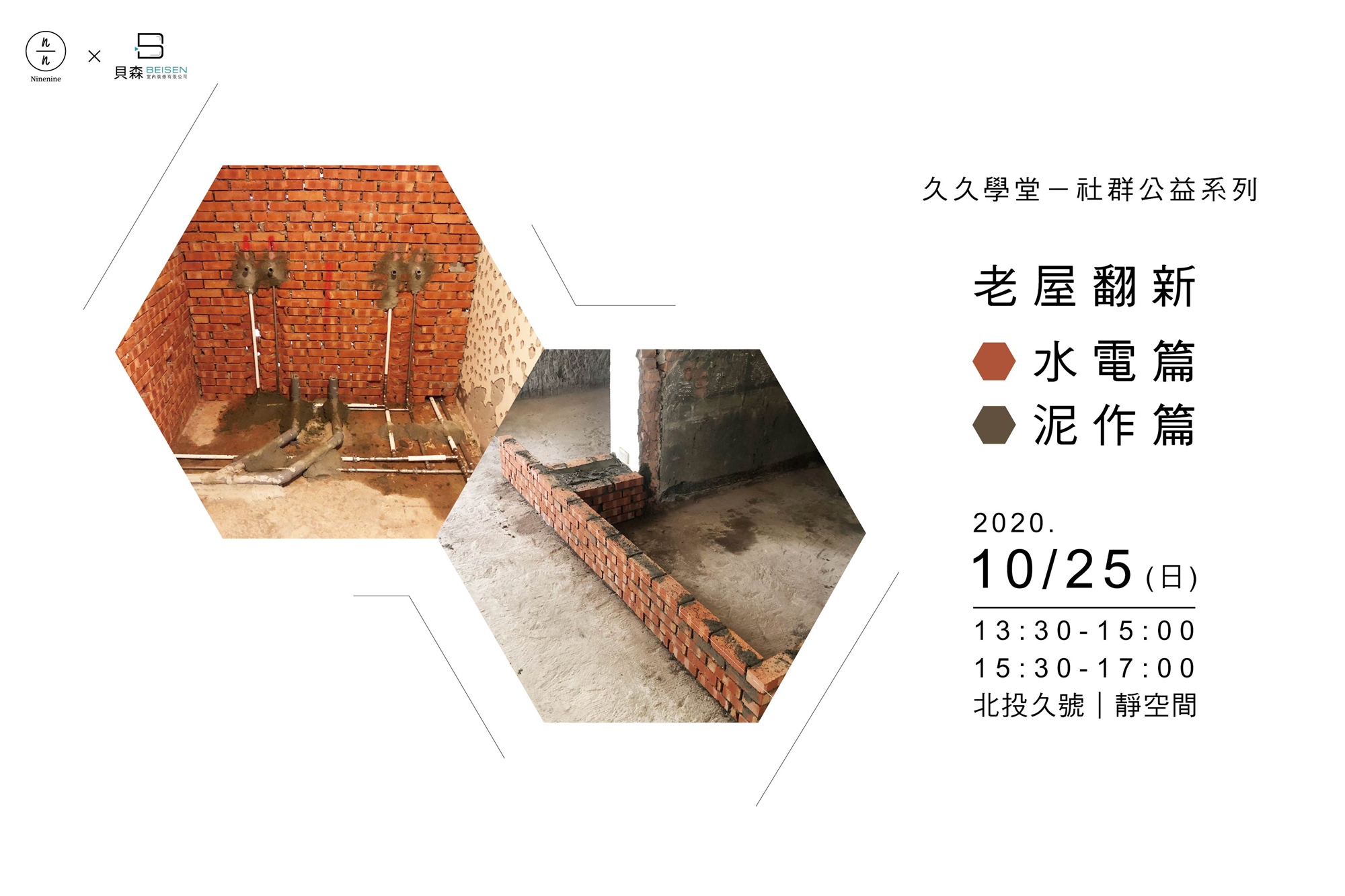 此次課程將分為上下場來介紹如何老屋翻新,因此久號特別請了兩位對於水電及泥作非常擅長的講師來帶大家了解相關經驗及注意事項。