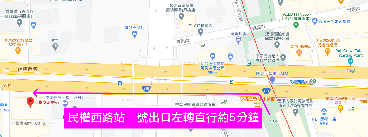 1. 捷運民權西路1號出口,出來後左轉直行約5分鐘即可到達