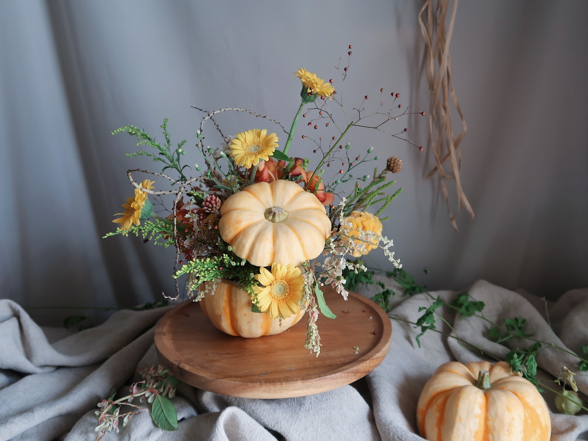 / 課程中每位學員可完成1個南瓜鮮花桌花(成品尺寸高25*寬25公分)