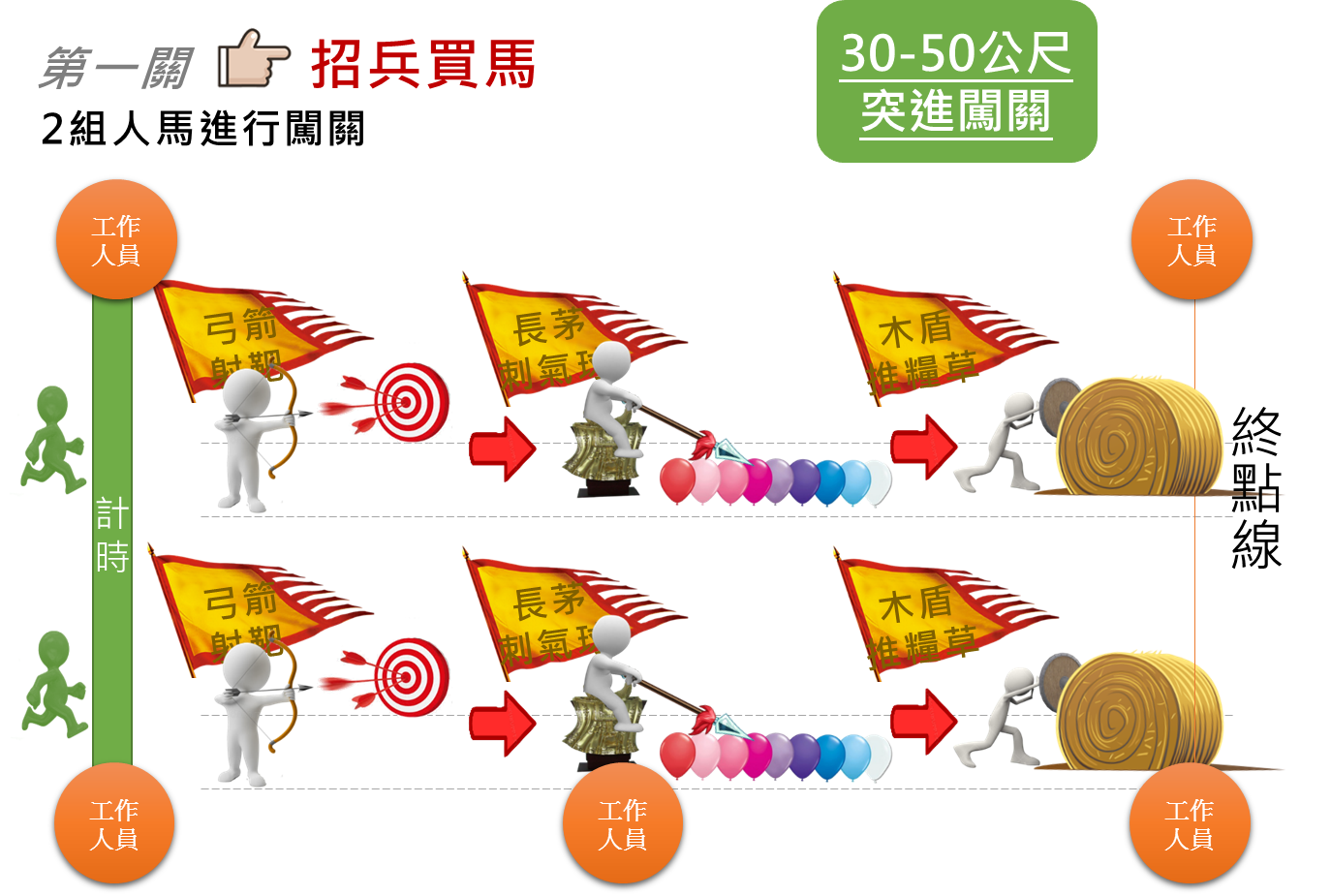30-50公尺突進闖關,依序完成弓箭射靶、長茅刺氣球、木盾推糧草。