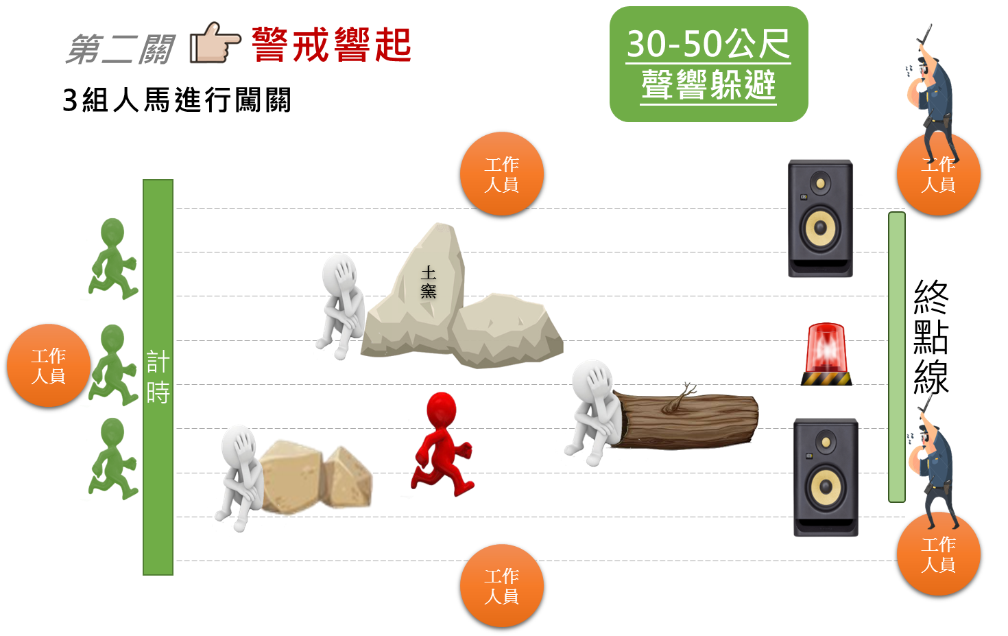 30-50公尺躲避聲響闖關,當前方警戒聲響起時,找掩蔽閃躲或趴下。