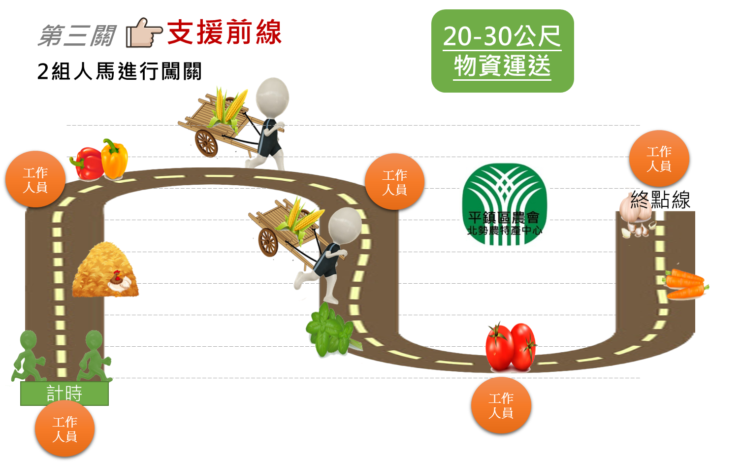 20-30公尺物資運送闖關,拾起沿路的農產品及糧草,奔向前線終點。