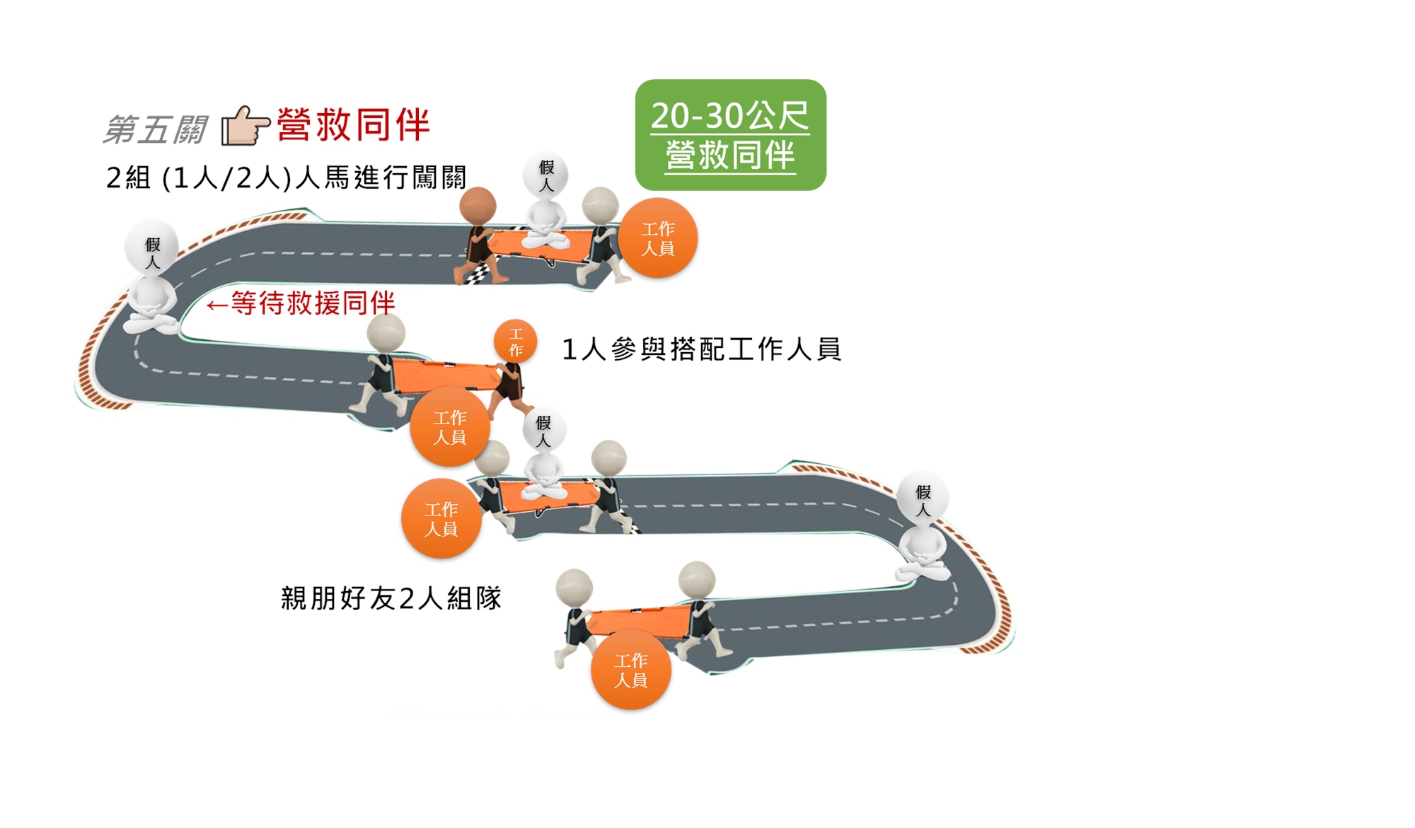 載運夥伴闖關,使用擔架載運受傷同伴。