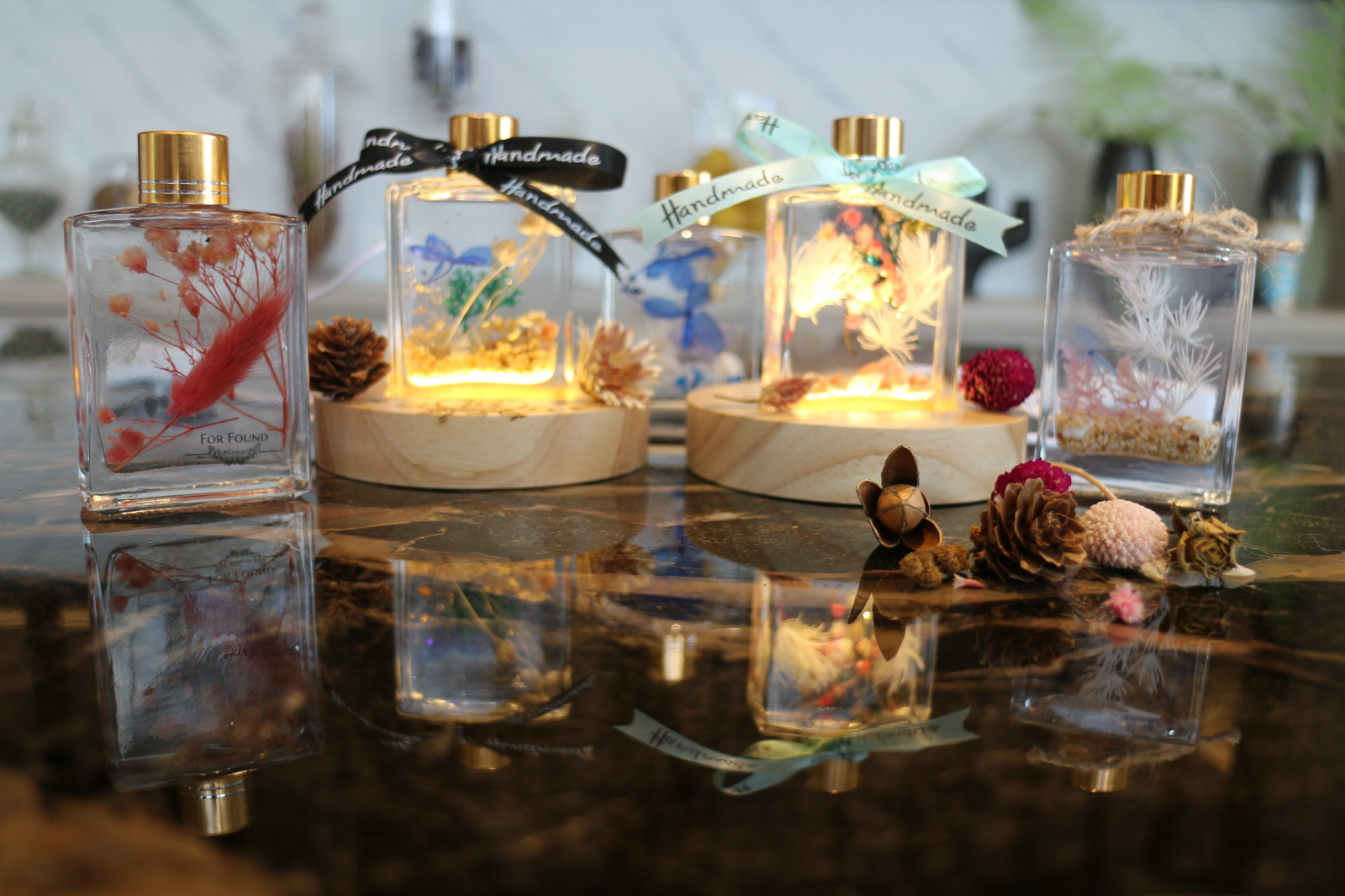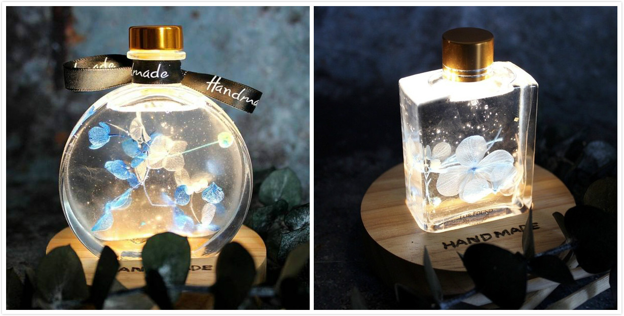 當乾燥花及永生花遍地皆為擺飾,看見了浮游花彷彿讓乾燥/永生花再次重生綻放。若是選擇浮游花瓶小夜燈,當木質底燈座照射浮游花,你會看見浮游花的光彩魅力!選擇彩妝刷具或圓珠筆你會看見原來日常生活小物可以兼具美麗與實用:)