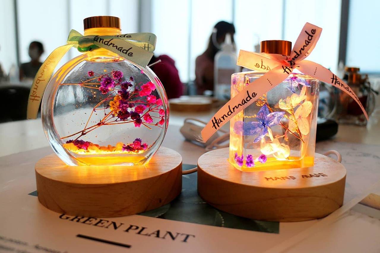 手作老師從花材介紹開始,教你挑選材料特性到如何成功搭配成自己喜歡的花的色彩,再將其他內容物擺放瓶中/筆中灌注專用油。最後木質底燈座可以電燒筆烙印自己想要的雕刻字,或是筆身上也可以雕刻打磨字。